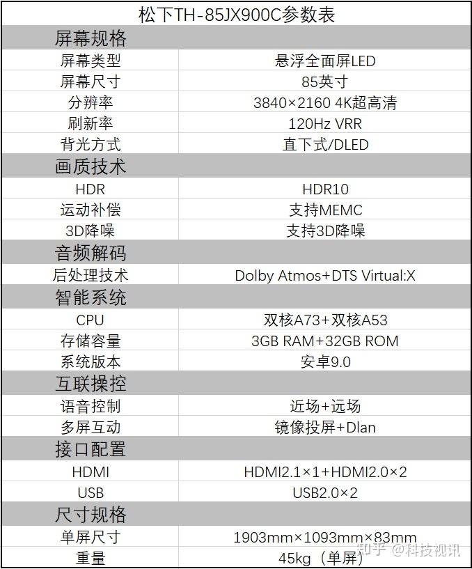 大疫无情,人间有爱,再大的困难也阻挡不了我们对生活和事业的热爱。正如克服疫情压力迎难而上的北京冬奥盛会,留给人们的不仅是光芒璀璨的荣誉佳绩,更是勇敢突破自身极限,追求更高更快更强的奥运精神。作为奥运全球合作伙伴,松下也迎来了高光时刻,在今年的春季新品发布会上以一款霸气的85英寸大屏旗舰突破自我,为广大用户毅然开启了全新的巨幕时代。 ![]() 日系电视在市场上一直是高端品质的代表,在今天依然在中高端市场上牢牢占据一席之地。松下JX900C采用了120Hz高档液晶面板,再加上多年研发的丽可彩六色优化引擎等画质黑科技,松下为这款新品倾注了最高配置,为用户打造影院级巨幕体验。这款松下电视新旗舰现已来到科技视讯数码评测室,它到底有着怎样的画质表现,就请网友们跟着编辑的镜头抢先一睹为快。 ![]() 85英寸巨幕带来的沉浸式体验 作为JX900C系列中的最新款,松下TH-85JX900C是一款85英寸大屏幕电视,屏体宽度达到了1903mm,超过了大多数成年人的臂展,置于客厅C位自有一股当之无愧的私人影院风范。 ![]() ![]() 这款巨幕电视采用了松下独到的DLED悬浮全面屏设计,85英寸的大屏画面仿佛悬浮在空中,让视野更加开阔,为用户提供了沉浸式享受。 ![]() ![]() 细节方面也经得起挑剔的审视,U型一体不锈钢工艺的超窄边框做工相当精致,并且解决了边框缝隙痛点,脱离了有碍观瞻的灰尘侵扰,整体更显美观大气。 ![]() ![]() 电视配备了一对高强度金属底座,轻松支撑85英寸电视的庞大身躯。支架背面还贴心地设有集线扣,高清线、电源线不会撒得到处都是了,让客厅看起来更加整洁。 ![]() 电视的接口非常丰富,配备了HDMI2.1×1,HDMI2.0×2(其中一个是支持8声道的eARC接口),USB×2,有线网络接口、音\视频输入接口等等,能够同时接驳游戏主机、音箱等外接设备,娱乐扩展性非常充沛。 ![]() ![]() 电视背面的做工也比较精致,外壳的下半部分还印有雕纹。总体来看,在松下多年成熟的设计工艺和制造技术下,这款85英寸电视融时尚简洁和霸气视野于一身,精致耐看也撑得起气场,摆在客厅中也是一道靓丽的风景。关于这款大屏电视的外观就看到这里,下面我们再来探究一下它的技术内涵。 黑科技让视觉更加惊艳 为了给用户带来更好的画质体验,松下在这款新一代大屏旗舰上倾注了六色驱动、区域控光、3D降噪等一系列黑科技,并且应用了新一代120Hz高刷新率优质液晶面板,让用户能够享受到色彩更加惊艳的流畅画面,无论是观看好莱坞大片还是畅玩游戏,都能够获得至臻画质体验。 ![]() 丽可彩六色优化引擎是松下多年研发的画质增强技术,在传统RGB三色基础上增加了CMY辅色优化,能够大幅提升电视的色域范围,让电视画面的色彩更加真实自然,提升观众的沉浸感。 ![]() 除了对色彩进行优化,这款电视对HDR10的支持也是一大看点。HDR技术全称为“高动态范围图像功能”,根据每个曝光时间相对应最佳细节的LDR图像,来合成出最终的HDR图像,通过还原出更多的画面细节,让画质更加接近真实环境中的视觉效果。 ![]() 一款电视要真正实现HDR画质,需要一系列的硬件和技术支持。松下TH-85JX900C电视配置了独立画质芯片和四核CPU+双核GPU组成的智能芯片,再加上3+32GB大容量内存,无论是在线观影还是玩游戏都能够更好地提升清晰度和对比度,完善图像细节。 ![]() 此外,这款85英寸巨幕电视还配备了松下独有的“感知转换”电光转换功能,通过更有立体感的光影明暗特性,极大地增加了画面层次感。由此,松下TH-85JX900C完全符合HDR10标准,并且支持杜比视界,带给观众新一代HDR画质的超凡体验。 ![]() 为了进一步改善暗场画质提升画面质感,松下TH-85JX900C还采用了区域控光技术和3D降噪技术,前者能够对画面的每个动态区域进行背光管理,增强对比度和亮度。后者能够将前后两帧图像进行对比筛选,筛选出噪点位置进行增益,让暗场视频画面更加纯净。 ![]() 一款优秀的电视在性能表现上当然不能仅有画质,还必须有着动人的音效。松下TH-85JX900C搭载了杜比音频解码技术,并且能够支持DTS Virtual:X,音质更加纯正,在客厅空间内能够营造更加磅礴大气的立体音效。关于这款电视的技术我们就探究到这里,下面我们就通过一系列主客观测试来领略一下它的音画表现。 精准色彩 以真实打动人心 接下来我们就进入画质实测环节,通过一系列主客观测试来衡量一下松下TH-85JX900C电视的画质水准。首先还是用专业仪器对电视的色域和色准进行测试,可以看到松下TH-85JX900C的色域表现还是不错的,sRGB色域为98.6%,P3色域接近了90%,达到了影院级的高色域水准,为这款电视的画质奠定了深厚的根基。 ![]() 而在色准方面,松下TH-85JX900C电视的表现也是非常出色的,平均ΔE值仅为0.49,红黄蓝三原色的色准大多在0.1-0.2左右,整体表现在液晶屏中属于顶尖水准!优秀的色域和色准表现,让这款电视能够为我们带来更加真实自然的绚丽画质,接下来我们就通过更多测试环节来验证一下。 ![]() ![]() 松下TH-85JX900C在客观测试环节中的表现如此优秀,实际画质表现是否同样精彩呢?首先来看一组图赏测试,这组画质精美的图片全都采用了标准4K分辨率,每一张都具备强光和阴影等高动态画质场景,对于显示设备是一个不小的挑战。 ![]() ![]() ![]() ![]() ![]() ![]() ![]() ![]() 我们可以看到,白天场景中的艳阳和云彩都没有因为过曝而失去
