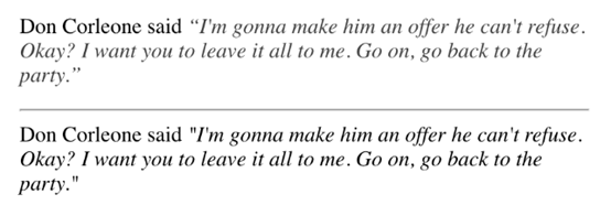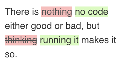 浏览器支持: ![]() 5. 校对文本当你想显示历史编辑及校对的情况时, 示例: ![]() HTML: <blockquote>There is <del>nothing</del> <ins>no code</ins> either good or bad, but <del>thinking</del> <ins>running it</ins> makes it so. </blockquote> CSS: del {text-decoration: line-through; background-color: #fbb; color: #555; } ins { text-decoration: none; background-color: #d4fcbc; } blockquote { padding-left: 15px; line-height: 30px; border-left: 3px solid #d7d7db; font-size: 1rem; background: #eee; width: 200px; } 6.更统一的引号由于中英文引号的不同,使用 ![]() HTML: Don Corleone said <q cite="https://www.imdb.com/title/tt0068646/quotes/qt0361877">I'm gonna make him an offer he can't refuse. Okay? I want you to leave it all to me. Go on, go back to the party.</q></p><hr/> Don Corleone said <i>"I'm gonna make him an offer he can't refuse. Okay? I want you to leave it all to me. Go on, go back to the party."</i> CSS: body {margin: 50px; } q { font-style: italic; color: #000000bf; } 7. 键盘标签