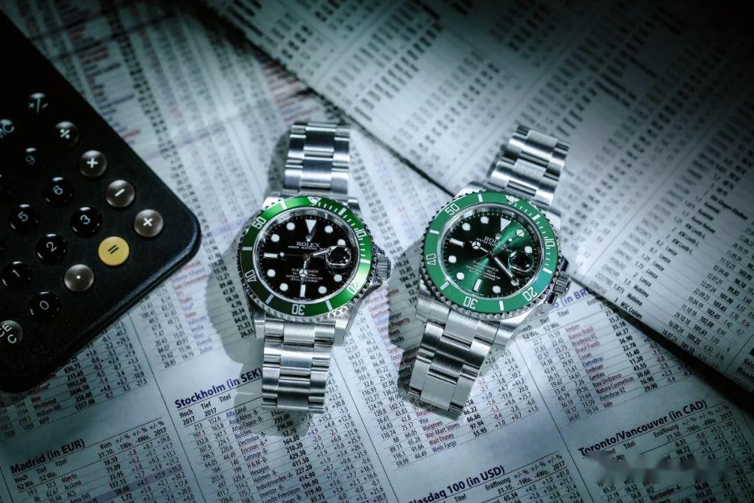 SubmarinerDate的价格始终呈上扬趋势:业已停产的绿色铝圈款(左)更甚于新的陶瓷表圈全绿版本