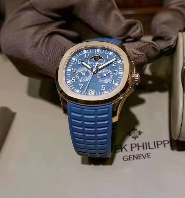 表盘材质:灰蓝色表盘饰有Aquanaut浮雕图案,搭配覆白色荧光涂层的金质立体字块。