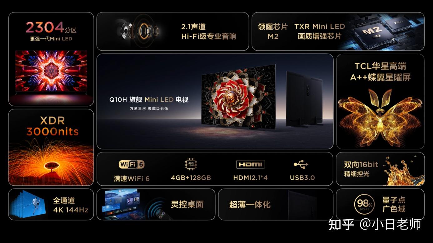 TCL Q10H正式发布 再造Mini LED电视显示巅峰 向影音爱好者致敬5月9日,中国电视的全球领跑者TCL正式召开了“向影音爱好者致敬”TCL Q10H旗舰Mini LED电视新品发布会。TCL致力于领先显示技术的研发,在电视领域不断刷新行业新高度。本次发布的TCL Q10H电视拥有最高2304个Mini LED背光分区、XDR 3000nits峰值亮度,屏幕采用了TCL华星高端A++蝶翼星曜屏,以及行业首创的灵控桌面系统。TCL Q10H全系共有65/75/85/98四个尺寸,65吋新品上市价7999元,75吋新品上市价10999元,85吋新品上市价14999元,98吋新品上市价25999元。 ![]() 2023年最值得买的旗舰Mini LED电视 TCL Q10H旗舰Mini LED电视采用微米级的 Mini LED灯珠,拥有最高2304个Mini LED分区、XDR 3000nits峰值亮度以及3000万:1的超高动态对比度,在亮度、对比度、动态范围等画质关键维度都大幅度提升,呈现的画面更接近自然实景,为消费者带来前所未有的视觉体验。 ![]() 此外,TCL Q10H电视的屏幕采用了TCL华星高端A++蝶翼星曜屏,带来5倍对比度提升、2.3%超低反射率和超过178°超大可视角度的出色表现,可以呈现出Mini LED更加通透和惊艳的画面。TCL Q10H依然采用了TCL全球领先的量子点Pro 2023技术,实现了98%的DCI-P3高色域,可显示10.7亿级色彩,色彩纯度也提升58.3%,亮度提升了10%,色准更是做到ΔE<0.99,色彩表现更加精准。 芯片方面,TCL Q10H采用了行业领先的1+1+N矩阵式芯片架构,搭载了一颗主芯片领曜芯片M2和一颗独立的TXR画质增强芯片,以及576颗背光驱动芯片,集成了20多项TCL自研画质调校算法,带来了超强的智慧感知能力,可以像素级的对画质进行调校,向消费者呈现典藏级的影像体验。 全面出众,行业顶级硬核配置 除了在硬件方面的表现出色以外,TCL Q10H电视还搭载了业内创新的灵控桌面系统,颠覆传统电视的繁琐模式,真正实现无开机广告和全面定制化,加上0.5秒快速开启影音、自定义快捷键等便捷功能,全面提升消费者在使用电视时的交互体验。 ![]() 音质方面,TCL Q10H电视配备2.1声道Hi-Fi级专业音响,拥有5单元60W超大功率(98英寸产品为7单元80W),电视声音层次分明、清晰饱满,带来更震撼的音响效果。 科技向美而生,TCL Q10H外观采用金属全景全面屏设计,超薄一体化机身,优雅纤薄,可完美贴合墙壁,屏占比高达98%,让观影过程更加具有沉浸感。 此外,Q10H还配备了4个HDMI 2.1接口,支持全通道4K 144Hz真高刷。1个USB3.0接口,可以接入更专业的外设设备。采用了最先进WiFi 6,相比普通WiFi,网络传输速度更快、覆盖范围更广。Q10H还搭载了最大4GB+128GB的存储配置。电视运行速度更快、应用下载更多,Q10H无论是观影、听音乐、还是打游戏,体验更流畅。 向影音爱好者致敬 TCL Q10H旗舰爆款王 TCL Q10H旗舰Mini LED电视共有4个尺寸,5月9日晚8点正式开售!65吋新品上市价7999元,75吋新品上市价10999元,85吋新品上市价14999元,98吋新品上市价25999元。 ![]() 以科技创新不断提升用户体验,TCL是行业中鲜有真正做到倾听用户声音的一家科技企业。此次TCL Q10H电视与以往产品不同,是专门针对影音爱好者需求所打造的旗舰Mini LED电视。从产品调研、到技术研发、功能优化再到最终落地,每一项技术参数与软硬件调校,都是为了在画质及音质呈现上,全方面满足影音爱好者的观影需求,是TCL向影音爱好者致敬的用心之作。 以用户为中心,打造出更具质价比和市场标杆性的产品,是TCL一贯坚持的方向。此次发布的TCL Q10H旗舰Mini LED电视,有着行业同价位中“Mini LED分区最多、峰值亮度最高、音质最顶、工业设计最美、屏幕最高端” 的五大硬核特点,是2023年最值得买的旗舰Mini LED电视。