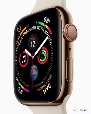 首款获得FDA认证并在消费类市场中出货数百万只的智能手表 据麦姆斯咨询介绍,苹果公司在2018年9月发布了Apple Watch Series 4,该款智能手表经过重新设计和打造,旨在帮助用户保持更紧密的联系,更加充满活力,并以强有力的新方法来管理自己的健康状况。在延续以往经典设计的基础上,Apple Watch Series 4更进一步优化,将各种全新硬件和软件增强功能与外观浑然一体地融合在一起,例如全新的MEMS加速度计和陀螺仪能够检测用户是否摔倒。值得关注的是获得FDA认证的心率监测功能,除了增强型光电容积描记图(PPG),Apple Watch Series 4还在智能手表中首次使用心电图(ECG)。