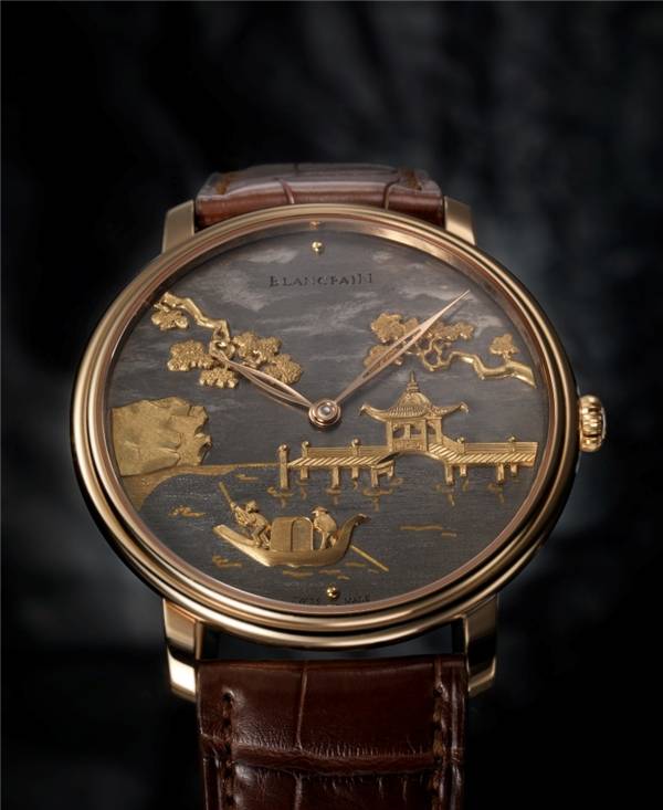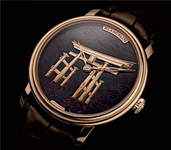 宝珀金雕机芯分别还原了瑞士、法国、日本、中国大陆及中国香港等地区的世界风情 赤铜:源自东瀛的传统工艺 赤铜工艺(Shakudō) 是一种主要由铜和金两种材质构成的合金,因原料比例及混溶程度而呈现出介于蓝黑与墨绿之间的深色光泽,变幻莫测。赤铜的独特光泽来自于叫做“钝化处理”的工序,工匠们将一种在日本传统工艺中被称为rokushō(绿青,主要成分为乙酸铜)的溶液反复涂刷在合金原料表面,通过特殊的化学反应使其表面颜色逐渐变深并呈现出独特的光泽。 赤铜工艺迄今已有百年历史, 曾备受武士青睐并用以装饰他们所佩武士刀( 一种长剑), 如今, 这种古老的工艺辗转流入瑞士的汝拉山谷,转而化为宝珀制表艺术大师手中精美不凡的表盘。