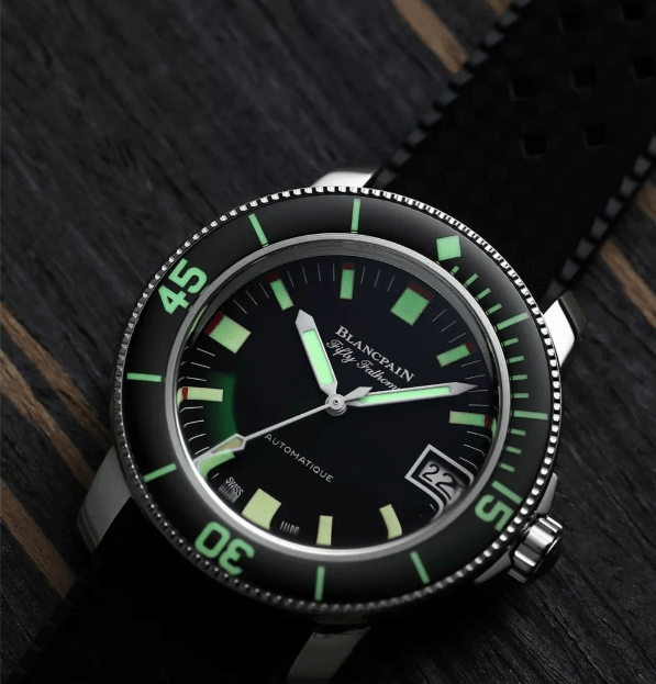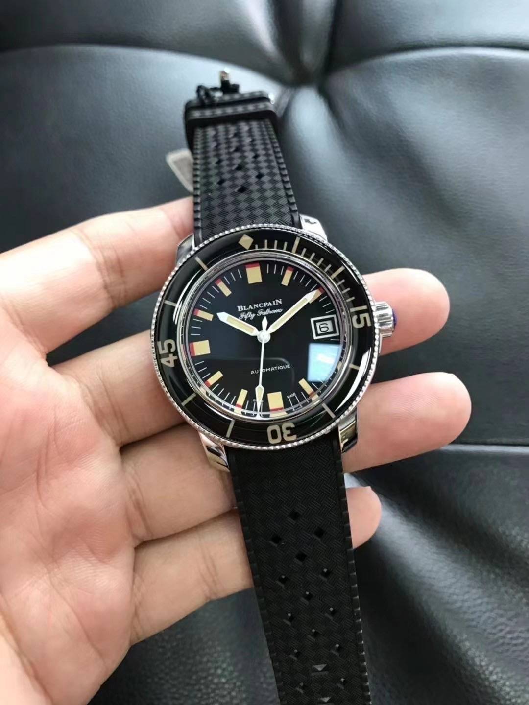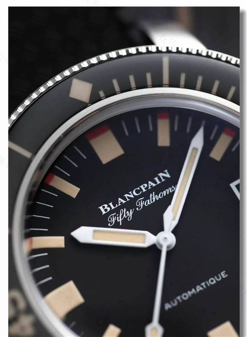 我是你们的老朋友,左腕表舍,专业腕表知识,有兴趣的朋友可以与我一起沟通交流,拒绝忽悠,让您在玩表之路不被坑。如果您也是一位手表爱好者,那么请您花两分钟的宝贵时间看完这篇文章。 大家都知道宝珀的五十噚起源于法国政府的“Nageuers de combat”突击蛙人部队。1953年,宝珀五十噚Fifty Fathoms诞生,略先于同年的劳力士Submariner水鬼和1957年发布的欧米茄Seamaster海马300,成为了最早的潜水表。而除了被装备于法军以外,凭借的优秀的性能,宝珀五十噚也被美国、德国、波兰的军队采购。1960年代,德国联邦海军陆战队通过一家名为“Barakuda梭子鱼”的潜水设备供应商定购了宝珀五十噚。这款手表最大的外观特色就是其采用了双色的刻度,内侧为米白色、外侧为红色,以提高读取时间的辨识度。其由此这款腕表也被俗称为“梭子鱼”。