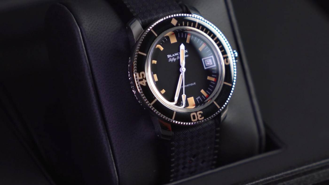 其实在产的宝珀五十噚,其实是分为两种,一种是蓝宝石外圈的,另一种是陶瓷外圈的。陶瓷外圈版本、表壳线条犀利的五十噚,原本是叫做“Bathyscaphe深潜器”,其并不是最正宗的五十噚。它属于另外一个系列,只是对于绝大部分表友而言,潜水表都长一个样子,难以区分。因此宝珀将原本的“Bathyscaphe”归入了五十噚Fifty Fathoms系列,并进行推广。正宗的五十噚是蓝宝石外圈版本的,弧面的蓝宝石旋转外圈的质感极佳,特别是在日光下,会呈现一种莹润感。而在黑夜,蓝宝石外圈下面的夜光刻度会透出来,和原版的亚克力外圈一样,比陶瓷外圈更加漂亮。