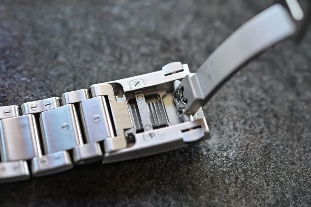 表扣做了一个很厉害的设计——快调装置,你可以直接压住带有GO logo的表扣进行微调链节(用脱下手表),最多可以调到将近一个链节。