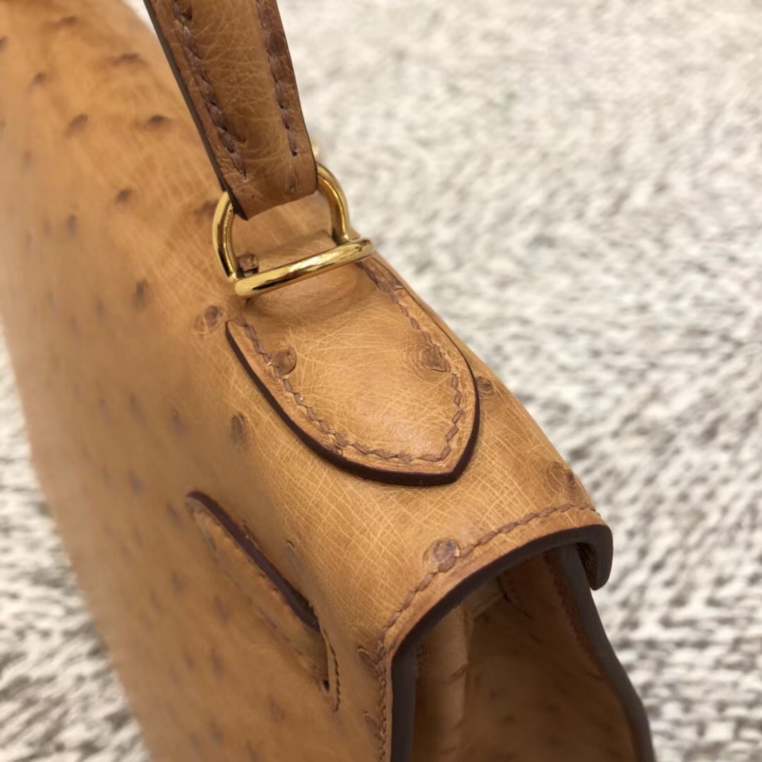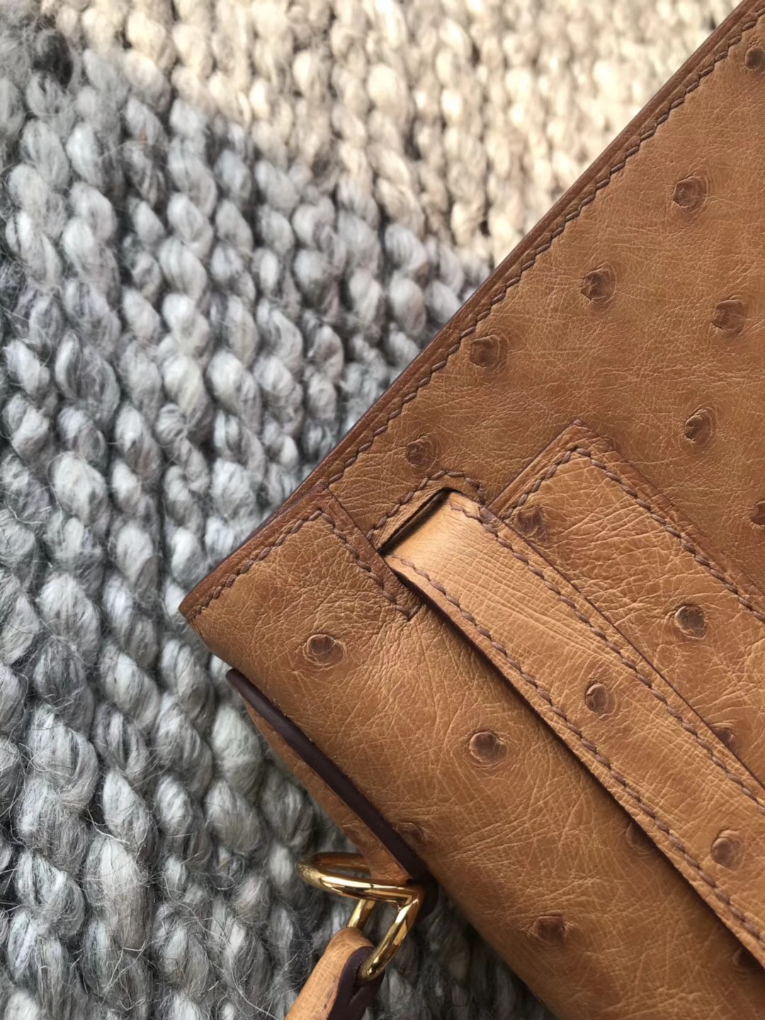 南非鸵鸟:皮面毛孔被压得很平,摸上去,也是平面的触感。--上面的黑点,都是毛孔,一张好皮,毛孔的大小要均匀,分布也要均匀。--一张鸵鸟皮的使用率很低,做一个kelly 32cm,基本要用一张半。--当然可以偷工减料,只用一张皮,剩下三分之一的皮料钱,但是两侧,就看不到毛孔了。