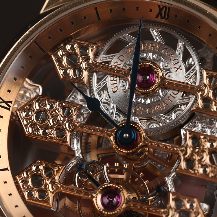 上世纪70年代,GP芝柏表决定将三桥传奇再现,令制表史上的经典重生,当时表厂耗1500小时工序,20枚现代版三金桥陀飞轮怀表于1981年正式面世。自始,品牌每年皆推出一款三金桥陀飞轮腕表,赋予经典更富现代感的气质。这款三金桥陀飞轮的三条夹板造型,与1860年赢得纳沙泰尔天文台一等奖的老祖宗结构同出一辙,经镂空处理的夹板活现一分当代美学特色。金桥夹板镂空和抛光打磨造工无瑕,工匠要用上七天时间处理始得此完美效果。陀飞轮由72个零件组成,直径约1厘米,仅重 0.3克,与一条鹅毛相若,可见其精妙细致之处;微型铂金上链摆陀装置于发条鼓底下,令机芯的独特造型结构毫无保留呈现眼前,此亦是表厂的专利技术之一。