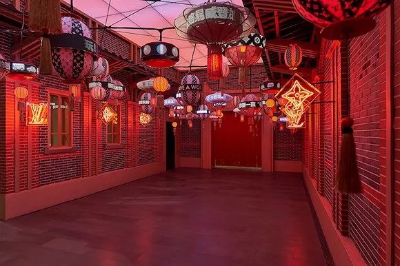 极具中国韵味的红色空间大大的红灯笼 与LV的英文字母利用现代化数码体验相融合
