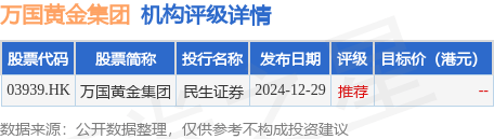 万国黄金集团(03939.HK)发布公告,预期集团截至2024年12月31日止年度取得公司拥有人应占溢利不少于人民币5.36亿,较截至2023年12月31日止年度(约人民币3.35亿)增加不少于60%。预期利润增加的主要原因是由于黄金产品销售量增加所致。 截至2025年3月6日收盘,万国黄金集团(03939.HK)报收于13.2港元,上涨1.54%,换手率0.12%,成交量126.21万股,成交额1648.44万港元。投行对该股的评级以推荐为主,近90天内共有1家投行给出推荐评级。民生证券最新一份研报给予万国黄金集团推荐评级。 机构评级详情见下表: