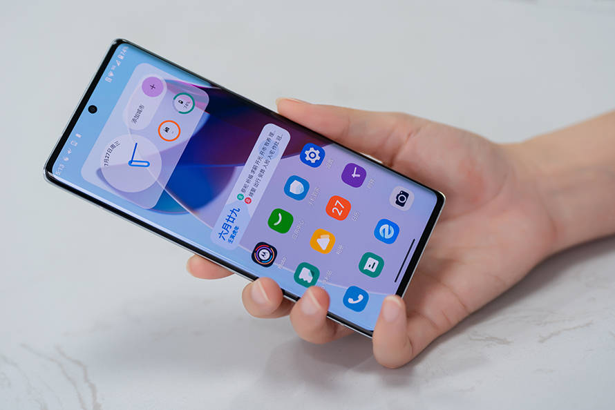 中置挖孔双微曲面 握持舒适手感佳 老规矩,先来聊一下手机的外观方面,机身正面是中置挖孔的双微曲面设计,屏幕6.7英寸大小,分辨率为2400*1080,但屏幕刷新率达到了144Hz,使用起来还是相当顺滑的,而且手机也加入了全程DC调光防闪烁功能,对于频闪敏感的用户来说相当友好。