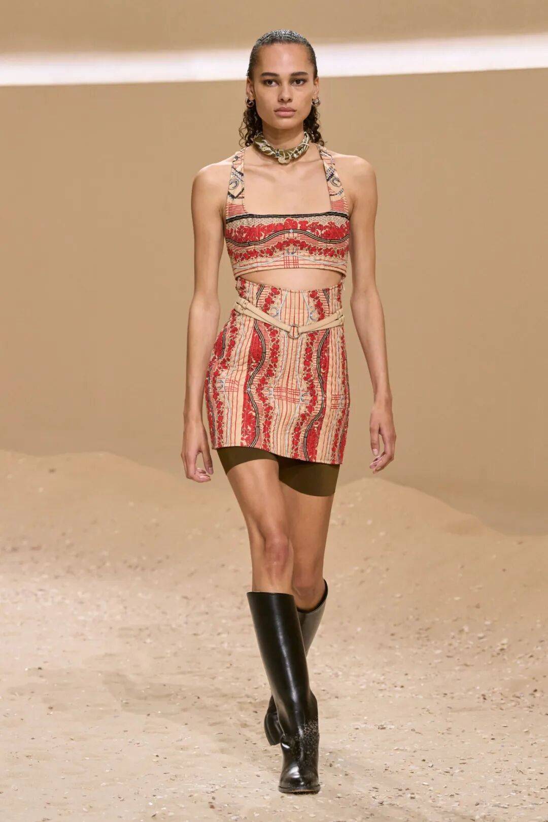 越过历史建筑的大门走进秀场,下一秒就被场内设计震撼了,从 T 台到观众席,地面都铺满粗粝的赭色“土壤”,仿佛踏进了一片自由而辽阔的天地,既是大地的象征,也代表了女性力量的根基。 本次,由爱马仕女装艺术总监 Nadège Vanhée 女士呈现的全新系列,呈现了“自由女骑士”的衣橱,灵感源于爱马仕档案馆中珍藏的一副来自 Camargue 的古老马鞍。