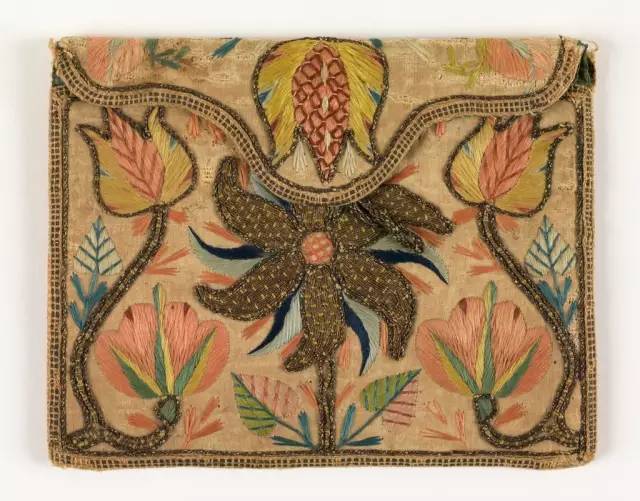 这只18世纪早期丝绸包袋受洛可可风格影响,包包多褶皱和花边,装饰隆重