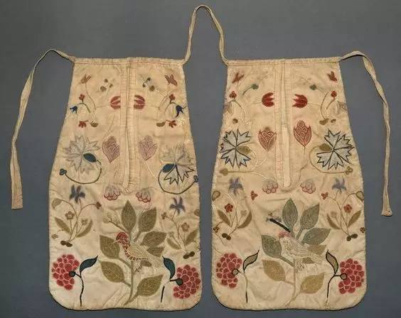 18世纪时期前期, 口袋成为一种放置随身物品的重要装备,通常在左右腰侧对称的掖在衬衫下面,隐藏在宽松的服饰里。口袋的花纹可能不够华丽繁琐,但是绝对针脚整齐细密,是彰显女性织工的好机会,口袋连同围裙和帽子成为18世纪主妇们的标准配置。