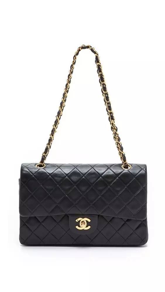 1955年2月,Coco chanel女士推出了一款配有金属链条的双层翻盖可闭合方形包