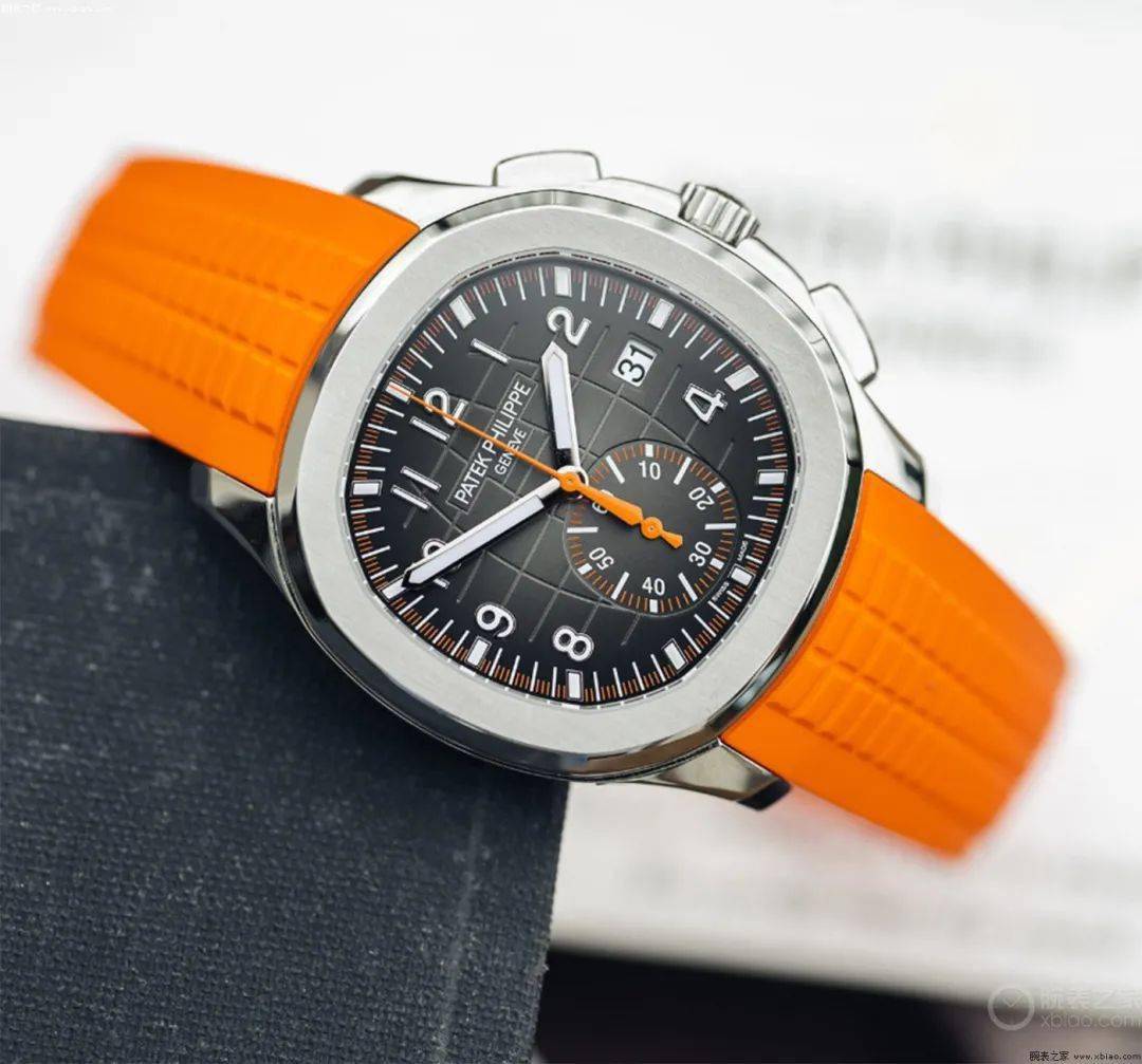 ▲百达翡丽手雷5168G,注意,是白金壳 2018年百达翡丽推出手雷5968。5968是手雷的计时型号,使用百达翡丽CH28自动计时机芯。最大的外观特点是,使用橘黄色配色,中央计时秒针、6点位60分钟计时盘以及盘面刻度,都是橙色的。加上可配橙色胶带,非常时尚。5968也是手雷中最热门,超公价幅度非常大的一款。