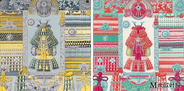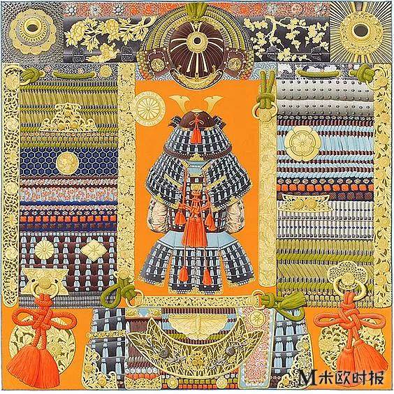 在参观埃米尔的爱马仕收藏品时,皮埃尔·玛丽停在刚刚修复过的马车灯笼前,对其精致的装饰感到震惊。 他还发现了其他四十多个形态各异的马灯,这激发了他创作爱马仕丝巾图案的灵感,有对角线的丝巾。 然后,他有了通过添加个人风格来突出其独创性的想法。 每盏灯成为一个马术场景的剧院。 马,海马和嵌合体在灯光下跳舞。 有些形成了卡鲁塞尔凯旋门,还有一些加上了一个骑手。 这些丝巾是对装饰艺术的一种颂扬,是对古代车马匠创造力的致敬。 4,日本武士