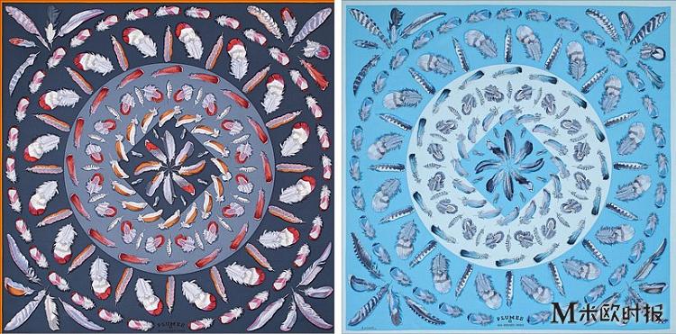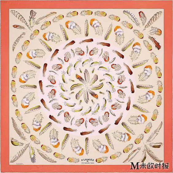 中世纪日本的武士有着样式丰富的盔甲。 从 Aline Honoré 设计的这个爱马仕丝巾图案的作品中可以找到十四到十八世纪期间十四个不同的元素。中间是一套青铜,铁,金,皮革,丝绸和漆器的盔甲,由 Myochin 学校制作。 在江户时代(1615 - 1868年),这种装饰多半属于一个富有的地主。 装饰细节设有花卉图案或氏族徽。 这些作品被保存在美国达拉斯的 Ann&Gabriel Barbier-Mueller 博物馆。 巴比尔 - 穆勒(Barbier-Mueller)这个收藏家族的第三代和第四代拥有近千件日本武士装备的私人收藏品,是世界上藏品最丰富的收藏家之一。 5,羽毛Des plumes