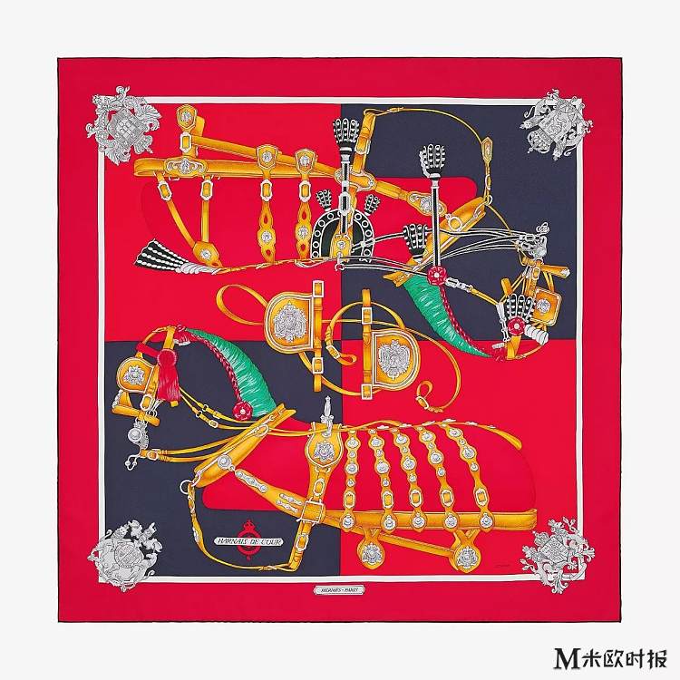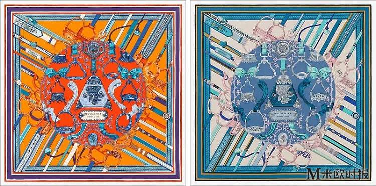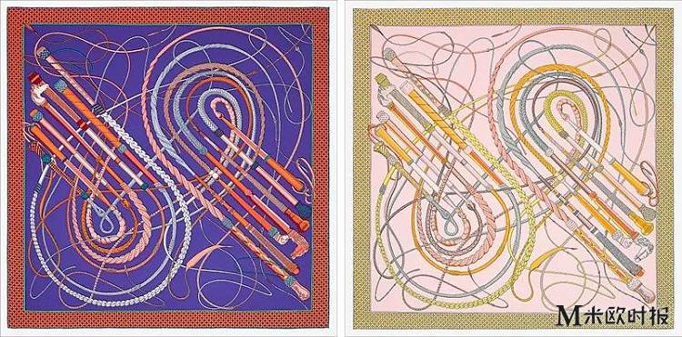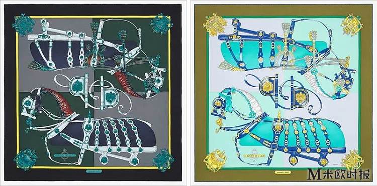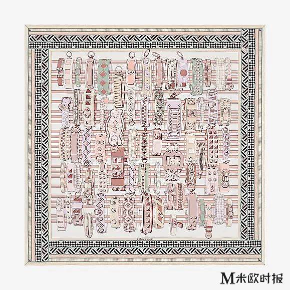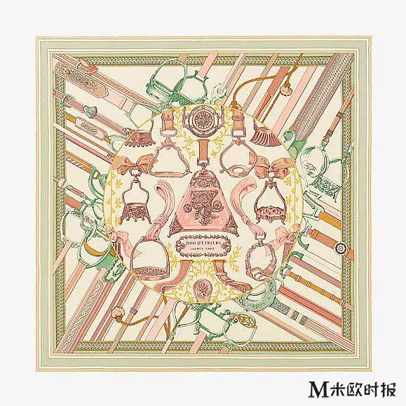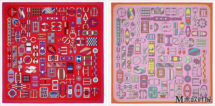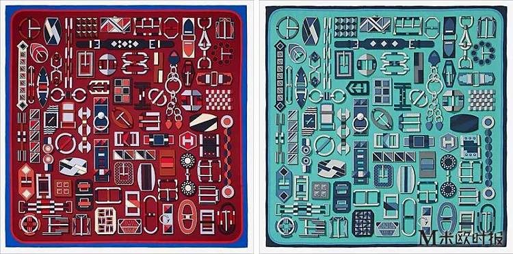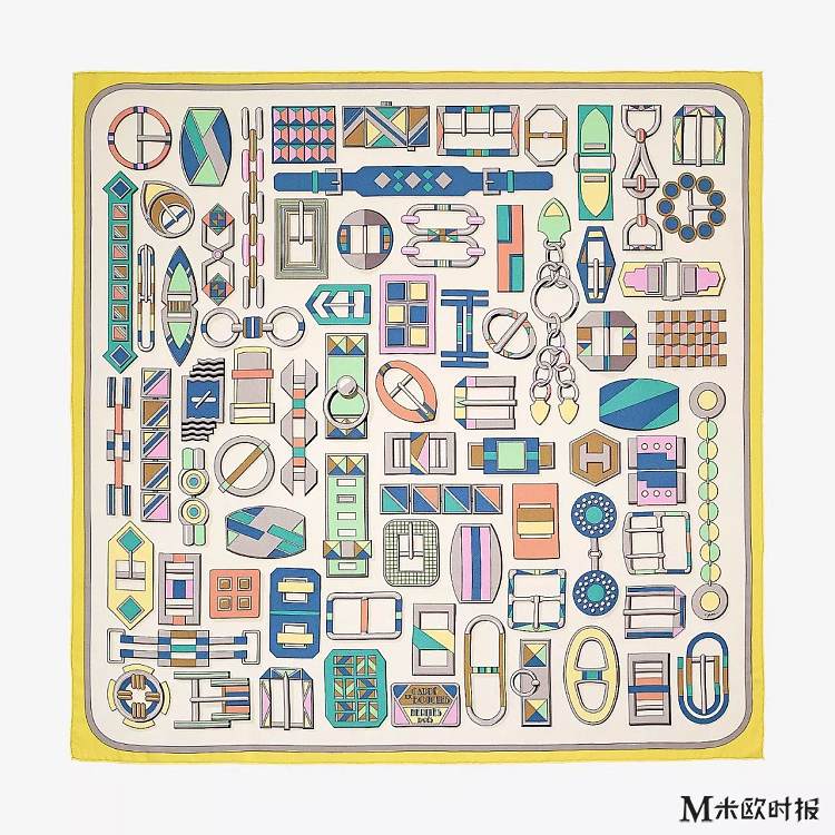 这个作品基于弗朗索瓦·德·拉·皮埃尔和维吉尼·雅明设计的两块方巾和两种截然不同的风格。 两位设计师在不同的时间都处理着同样的主题,并且是从爱马仕私人博物馆的十八、十九和二十世纪卓越的马术图案中,挑选来自世界各地的最好、最引人注目的马镫。而这款爱马仕丝巾图案作品完美的关键在于,无论设计是朴素低调的、抑或是装饰华丽的,每个部分都极好地契合了实用功能。作品的中心以弗朗索瓦·德·拉·皮埃尔最初设计的方巾的一个圆切为特色。 9,皮带扣Carre en Boucles