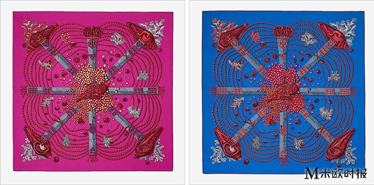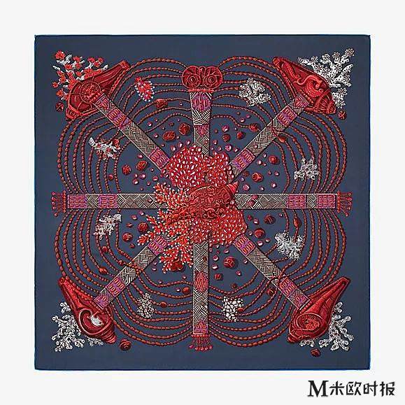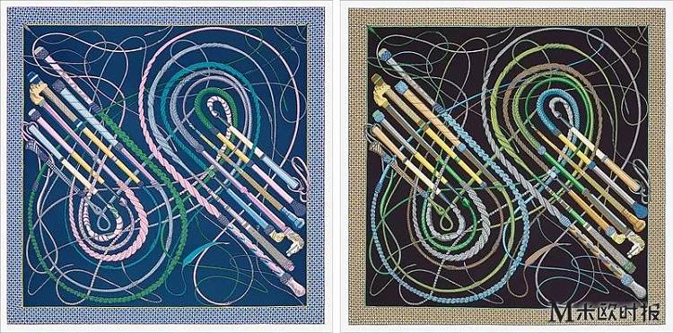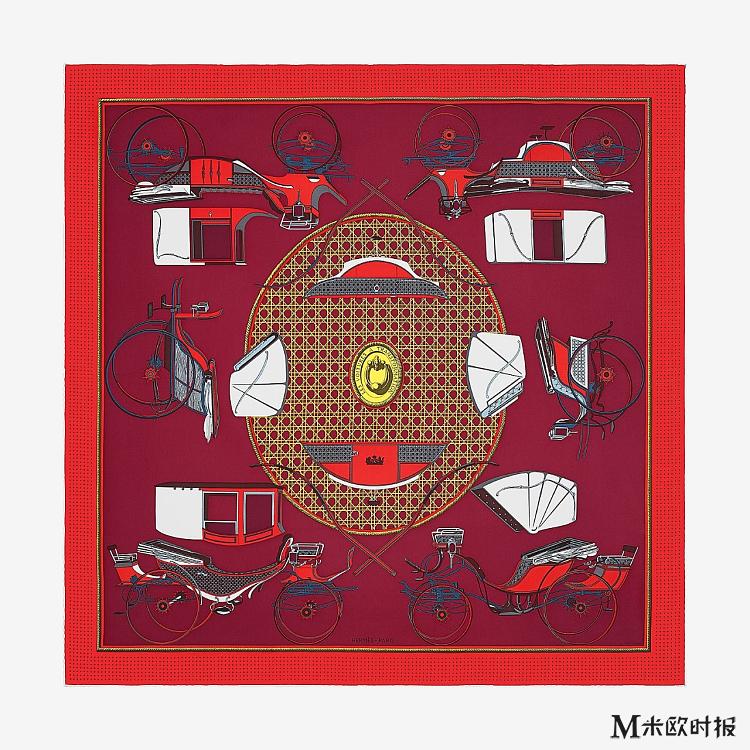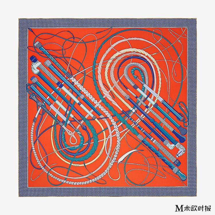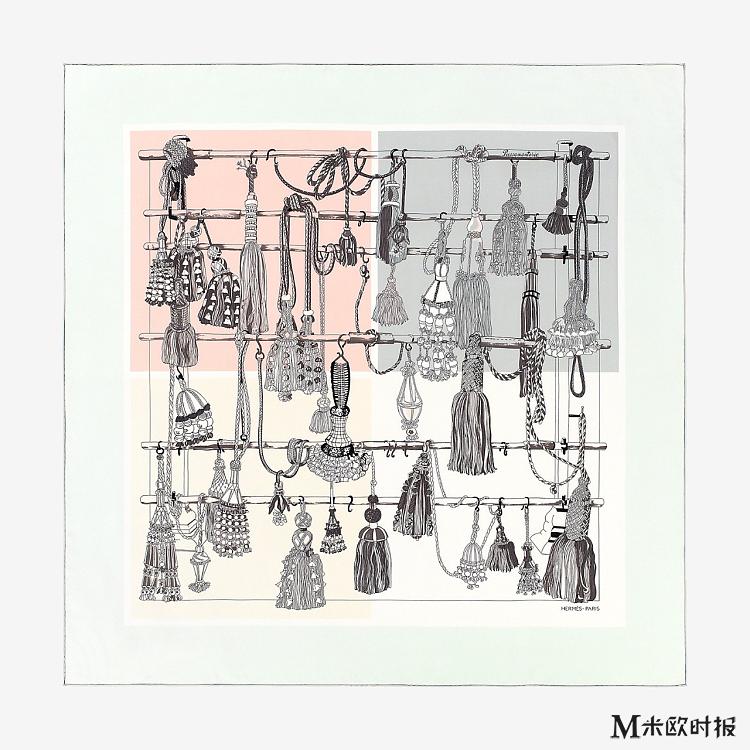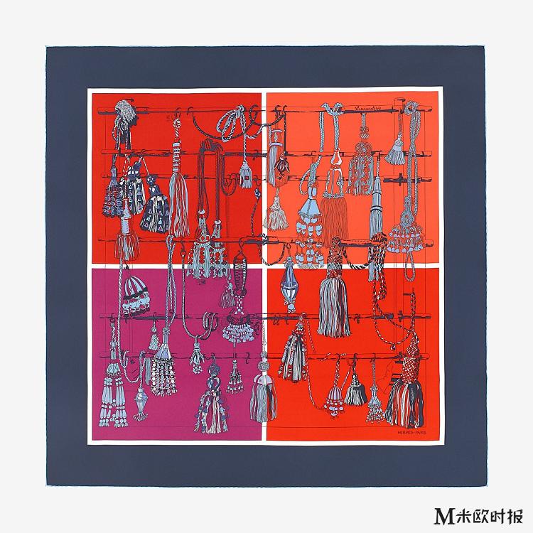 帕尔米拉在丝绸之路上,是古代世界重要的经济和文化交流中心。 纺织品,珠宝,木材,家具和雕塑从希腊,埃及,波斯和中国运送抵达那里。 她的宝藏在她死于罗马后仍留在罗马,并由 Annie Faivre 在这条围巾上精雕细琢而出。 16,流苏 在20世纪60年代初,当时的爱马仕总裁罗伯特·杜马斯被传统的流苏制造商的名录所吸引,并建议弗朗索瓦·赫伦为这些装饰性饰物制作一条丝巾。 艺术家决定在她的设计中用木质栏杆上的简单挂钩固定,并且挂上形态各异的绳子。 流苏的制作是一种超越世纪和时尚流行趋势的技能。 这条丝巾的设计被重新解释为一个呈现在彩色方块的四重奏形式。
