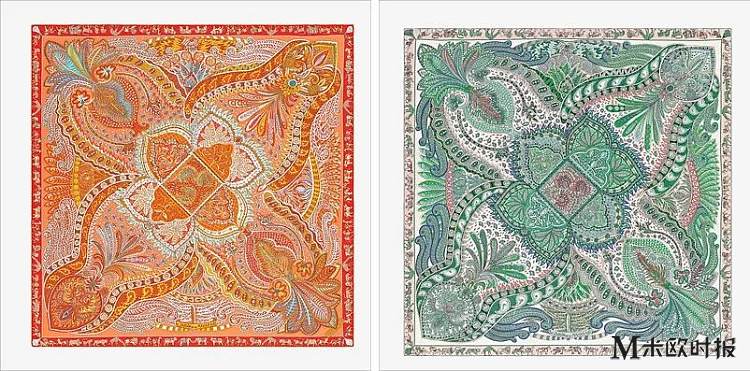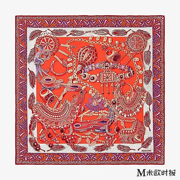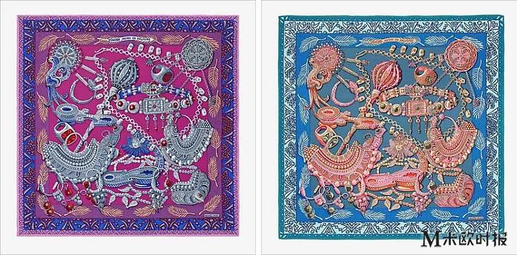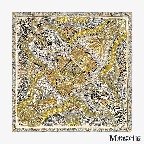 这条丝巾是受到莫卧儿图案的启发。出生在斋浦尔的 Maharani,是 Sawai Man Singh II 的第三任妻子,Cooch Behar 和 Gayatri Devi 公主。因此,她的品味受到印度和欧洲两种不同文化的影响。