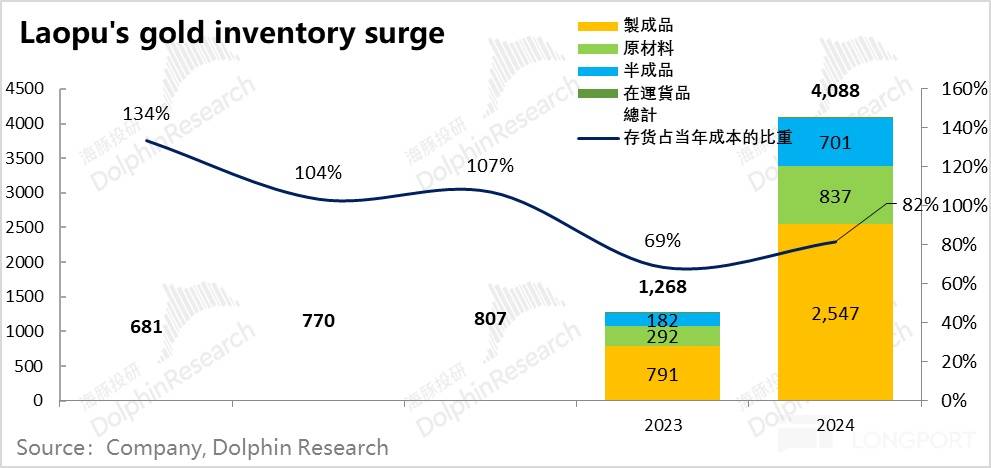 也就是说,当下公司在长大期,2024 年年末的存货是为 2025 年的收入做准备的,而且 2025 年收入也在扩张的情况下,2024 年的屯的黄金价值,也就是 2024 年成本的 82% 而已。