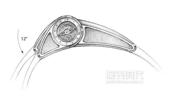 帕玛强尼BUGATTI TYPE 390设计手稿 一宗最: 12°铰接式表壳 Bugatti Type 390的表壳设计源于布加迪Chiron的流体曲线。表壳围绕气缸结构打造,可围绕其驱动轴旋转12°。此项技术正在申请专利,可谓是腕表设计领域的一个大胆创新。
