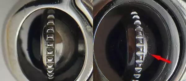 后盖螺丝孔为主鉴定核心点,从上图看出正品(左)螺丝孔为正圆,且边缘有倒角 不应有明显加工痕迹,仿品(右)螺丝孔明显不圆,且边缘切削毛刺明显无倒角做工。 6、表带部分鉴定核心点4