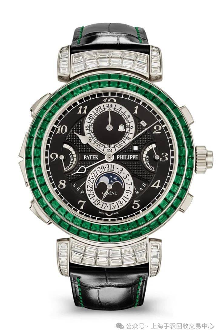 ▲未镶宝石的6300GR-001参考价为¥29,446,800。 既然品牌已经公开了所有产品的定价,那我们就来看看几个会让人下巴掉下来的天价金额产品,其中品牌常规系列现在定价最高的作品非Grandmaster Chime Haute Joaillerie 6300/403G莫属,它具有多达20项复杂功能、双面翻转设计,白金表壳镶有118颗祖母绿以及291颗钻石,它的定价是NT$ 148,840,000!搭载同一枚机芯、表壳未镶宝石的6300GR-001,定价也达到¥29,446,800之高。