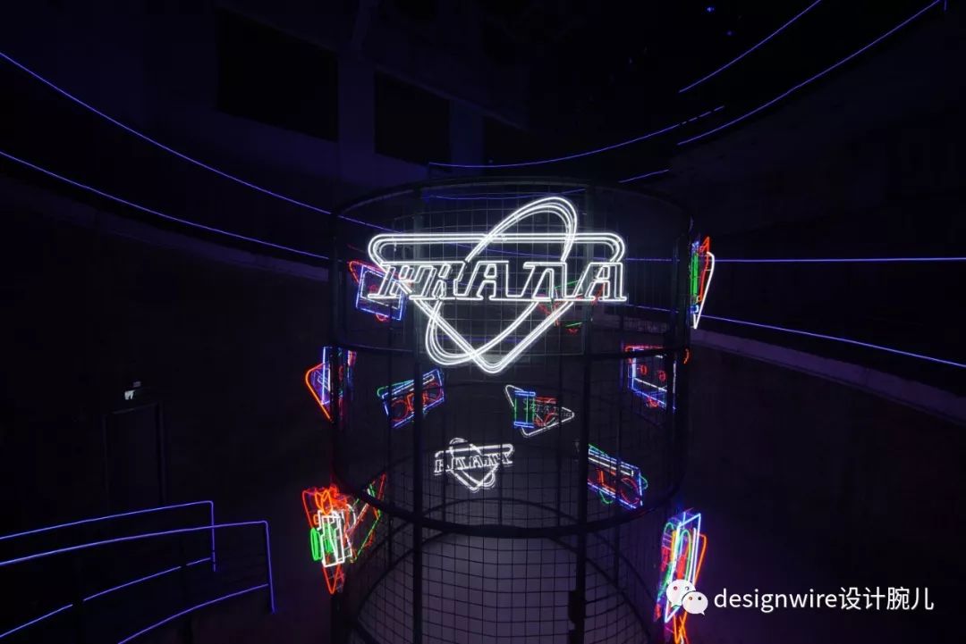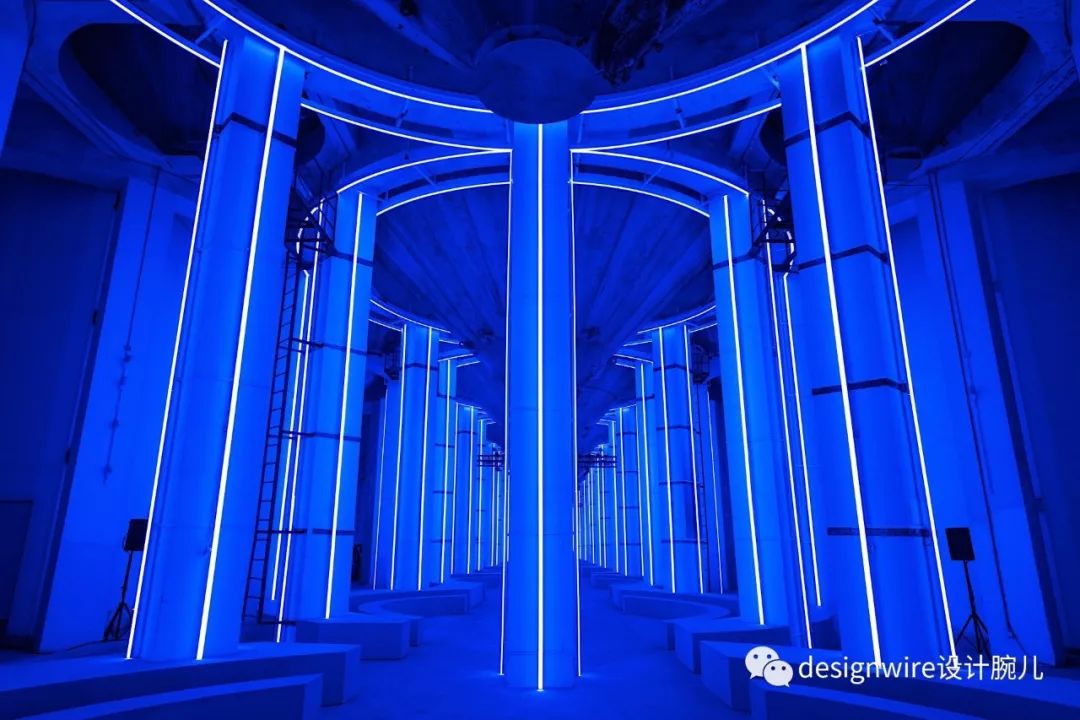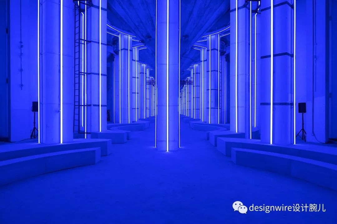 大厅内灯管装置勾勒工业形式语言,增强其错综复杂的几何感,以微妙柔和色彩营造出朦胧纵深。