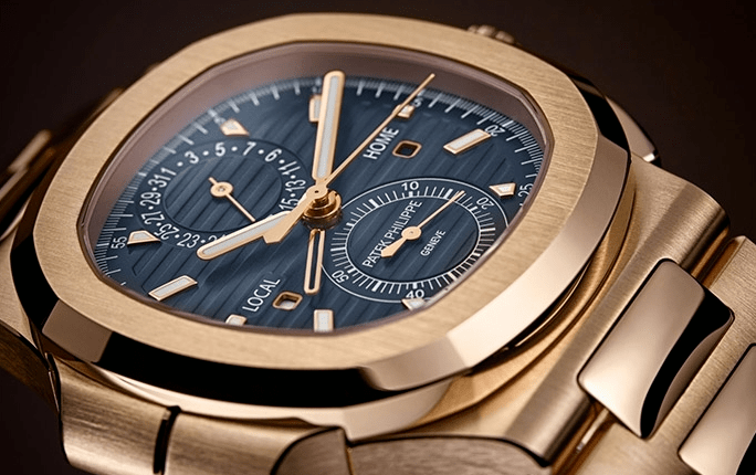 鹦鹉螺5990/1R-001,18K玫瑰金材质/CH 28-520 C FUS自动上链机心/计时码表功能、两地时间显示/防水120米/表径40.5mm