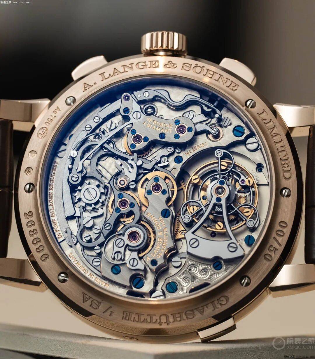 ▲朗格DATO计时万年历陀飞轮Lumen 实际上,一个计时万年历,本身已经是名表中的“顶配”了,直接对标百达翡丽的5270。但这只朗格,不光是计时万年历,还加上了一个陀飞轮,这一下就超出了百达翡丽一头。朗格在这只DATO上,使用了最新的计时万年历布局,计时盘和万年历日历,完全融为一体,盘面规整、和谐。陀飞轮它在哪?在手表背面。原本朗格DATO的L951手动计时机芯就已经极尽精美,计时部件错落,犹如微型城市。但这只表,还有一个巨大的、夺目的陀飞轮,而且还是停秒陀飞轮(L952.4机芯)。在打磨细节上,一个陀飞轮的“V形镂空夹板”,都是堪称精品的存在(因为内角需要大量手工打磨)。