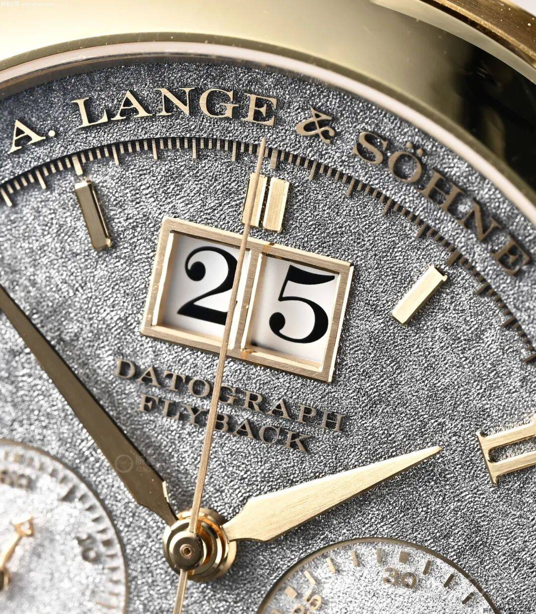 ▲朗格DATO计时“HANDWERKSKUNST”抖雕 各位可以看到,这只DATO的盘面,有“浮雕”效果,盘面有颗粒纹理装饰。这些都是手工雕刻出来的。朗格DATO计时HANDWERKSKUNS的表盘,是实金的。表盘先雕刻出LOGO、时标、刻度,这些凸起的部分。然后用刻刀一点儿一点儿凿出均匀的颗粒纹路,让颗粒纹路铺满表盘。然后,在细节上,再对凸起的时标等进行倒角。为了更大限度的展示“抖雕”,这只DATO取消了常规版上6点位的动力显示。我想强调的是,现在绝大部分名表的盘面纹理装饰,基本都是冲压的,真正手工雕刻的,已经极度稀少(皇家橡树的格纹,也是冲压的)。这也是这只DATO价值极高的原因。