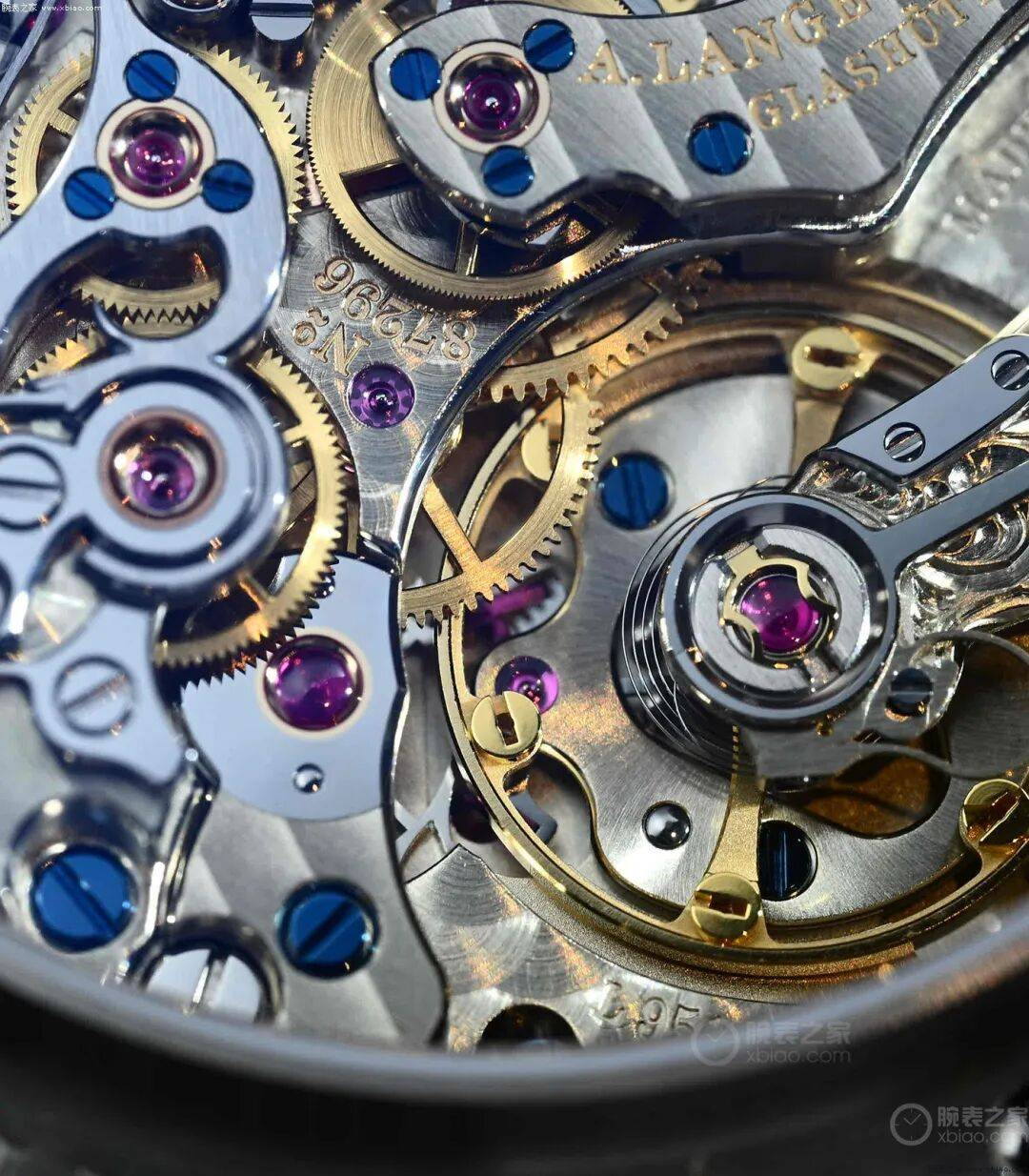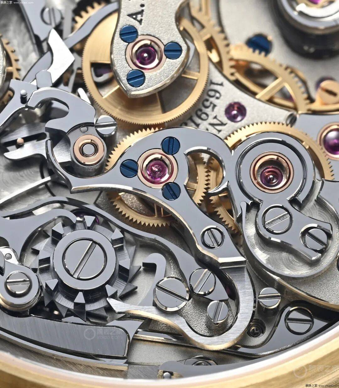 ▲盘面细节 这只蓝盘DATO,使用的是,标准版本的L951手动计时机芯,以及朗格标准的装饰方式。德国银夹板,上层夹板有格拉苏蒂条纹装饰,下层夹板是珍珠纹装饰,计时部件的杠杆以拉丝为主。