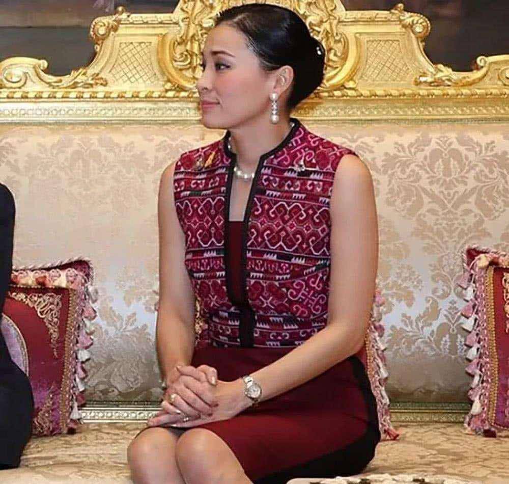帕公主和苏提拉王后是同一年所生,苏提拉王后作为帕公主的继母,两人一同出场,就吸收眼球,帕公主身穿浅粉色的套装,珍珠耳环,项链,发卡,比王后这一次的装饰还要多,但是明显比自己的继母更老,首先肤色暗沉,粉色也是黑黄皮妹子的雷区,这么看上去,帕公主稍逊色!