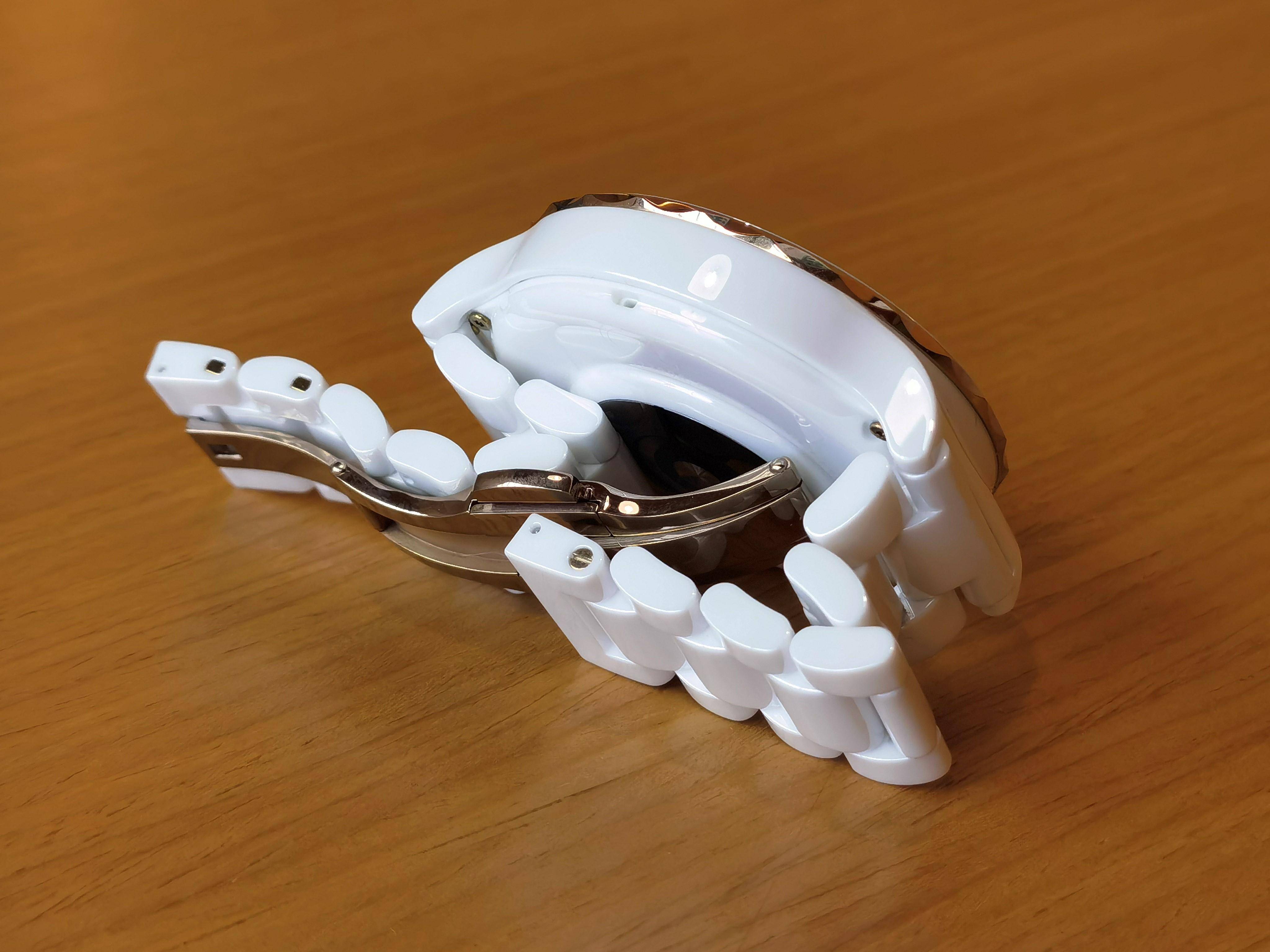同表体一样,陶瓷表带的材质采用的是纳米微晶陶瓷。这种陶瓷制造相当复杂,经过压制素胚,需求7天无连续1500℃高温煅烧才可得到契合高质量请求的资料。为了磨出抵达契合设计规范的表体和表带,出厂前会对名义以13道钻石抛光研磨工序,这个过程需求历经10天之久,最终才有了前面所说的洁白透亮的精致质感。