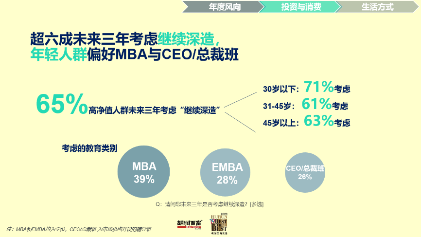 关于高净值人群的投资习气,讲演称,高净值人群未来三年将增加的投资依旧以股票为首,其次是黄金和银行存款。未来三年将减少的投资方面,住宅和商铺排在前两名,对基金、艺术品和货币投资的热情也不高。 “高净值人群以为今年上证指数将抵达3,810点,实践会抵达多少呢?2022年高净值人群以为上证指数将抵达3,720点,当年实践收盘值3,089点。2021年高净值人群以为上证指数将抵达3,660点,而当年实践收盘值3,640点,与之十分接近,是历年来最接近的一次。”胡润表示。 讲演称,高达65%的受访高净值人群未来三年思索继续进修,这是中国企业家不时以来的特征,而且这一比例比两年前又进步了十个百分点。”