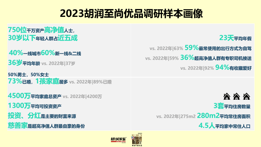 2023年3月1日,全球抢先的中国高净值人群权威研讨机构胡润研讨院发布《2023胡润至尚优品—中国高净值人群品牌倾向讲演》(Hurun Chinese Luxury Consumer Survey & Hurun Best of the Best Awards 2023)。这是胡润研讨院连续第十九年发布此讲演,旨在提示中国高净值人群的生活方式、消费习气以及品牌认知的转变与偏好,力图对中国高净值人群的生活形态变更做出描画。“胡润至尚优品”被普遍以为是面向高净值人群品牌的ISO。 本次调研750位千万资产中国高净值人士,其中亿元资产以上超高净值人士38人。平均家庭总资产4,500万元,平均可投资资产1,300万元。受访者40%来自一线城市,60%来自新一线和二线城市;平均年龄36岁,30岁以下受访者占46%;男女比例各一半;73%已婚(一孩家庭居多);平均常住房面积280平米。截至2021年初,中国具有千万人民币总财富的高净值家庭数量抵达206万户,具有亿元人民币总财富的超高净值家庭数量抵达13.3万户,依据《2021胡润财富讲演》。 胡润百富董事长兼首席调研官胡润表示:“在今年年初,世界首富是做朴素品的,是财富上万亿人民币的路易威登和迪奥的掌门人伯纳德·阿诺特,爱马仕、古驰和香奈儿的掌门人们都进入全球前50。高档皮包、手表纷繁全球断货。这一年,固然美国、日本和中东的消费者增长较快,对全球朴素品市场贡献绝对最大的依旧是中国消费者。希望我们这份讲演能辅佐那些面向中国高端消费者的品牌,去了解他们的生活方式、投资偏好和消费习气的变更。” “今年高净值人群的经济自信心比我想象的要高很多,抵达十年来最高水平。幸福指数也抵达近十年来最高,主要要素是家庭生活方面幸福度较高。由此可见,中国的高净值人群既对经济的未来很有自信心,个人的幸福感也很高。”胡润表示。 讲演显现,高端消费者对中国经济的贡献很大,中国高端消费市场范围抵达1.65万亿元,固然比去年降落了5%,主要由于奢华汽车市场范围降落了近两成。