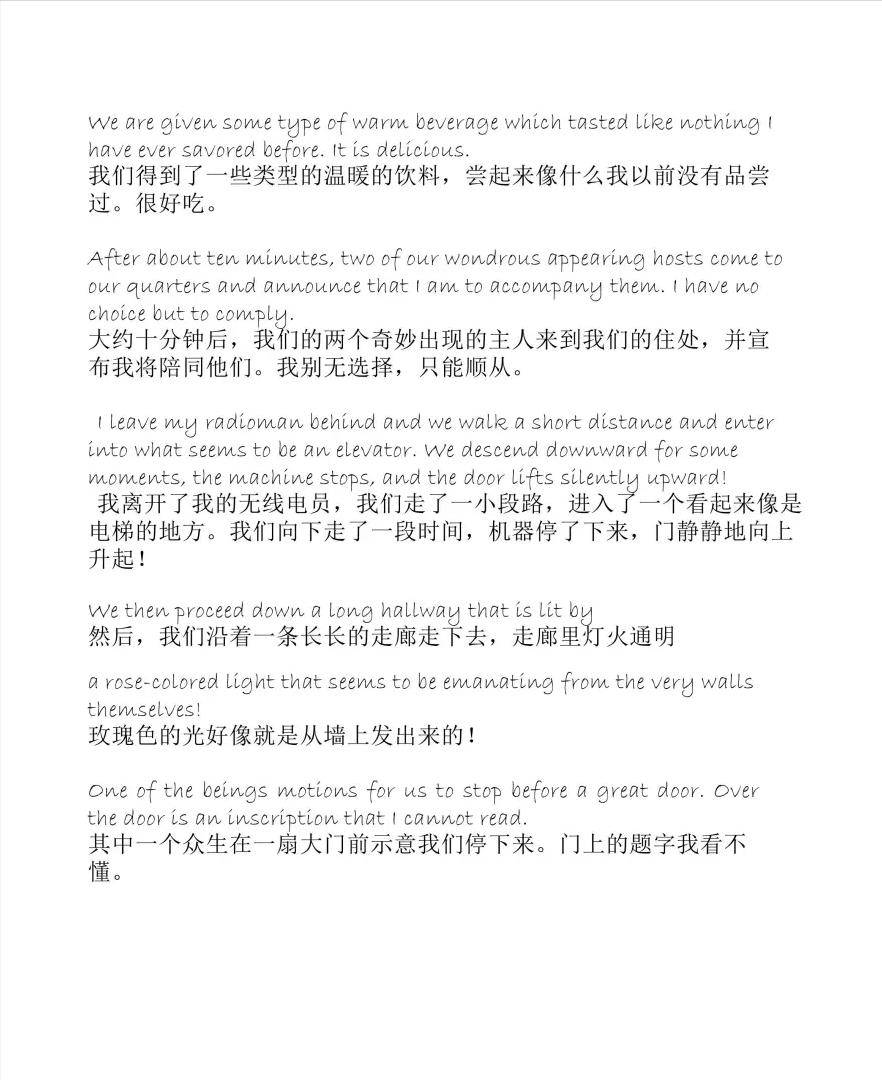 就在这时,飞机上的无线电忽然响了起来。飞机刚出事的时分,很明显是一切设备都失灵了,收音机也打不通了。此时,除了我还无法驾驶飞机外,其他设备似乎都恢复了正常。但是,飞机上的温度计显现了一个不应该的温度:23度。 收音机嗡嗡作响,忽然听到一个声音:将军,欢送来到我们的领地,您的飞机将在7分钟后降落,请不要惧怕,一切都会好的。 而伯德也试图在无线电里回答对话者,问他对话者是谁,在什么中央,但是说完这句话后,收音机的另一边就没有了声音。 又过了10分钟,飞机自动平稳的降落在了陆地上,然后伯德看到几个高大的人朝着他的飞机走来。他们看起来和人类没什么区别,当然他不肯定他们是不是人类?他们被礼貌地请下飞机,带到一个看起来像平台的中央,而与他们同行的维修人员则留在飞机上。这个平台状的东西能够自己移动,而且速度极高,眼前的景色在高速下变得含糊,但奇特的是,我却丝毫觉得不到脚下平台的移动。 很快,平台停在了一座金光闪闪的城市前,随后他被带到了一座建筑前。穿过长长的走廊,他看到了一位看上去很和蔼的老者。