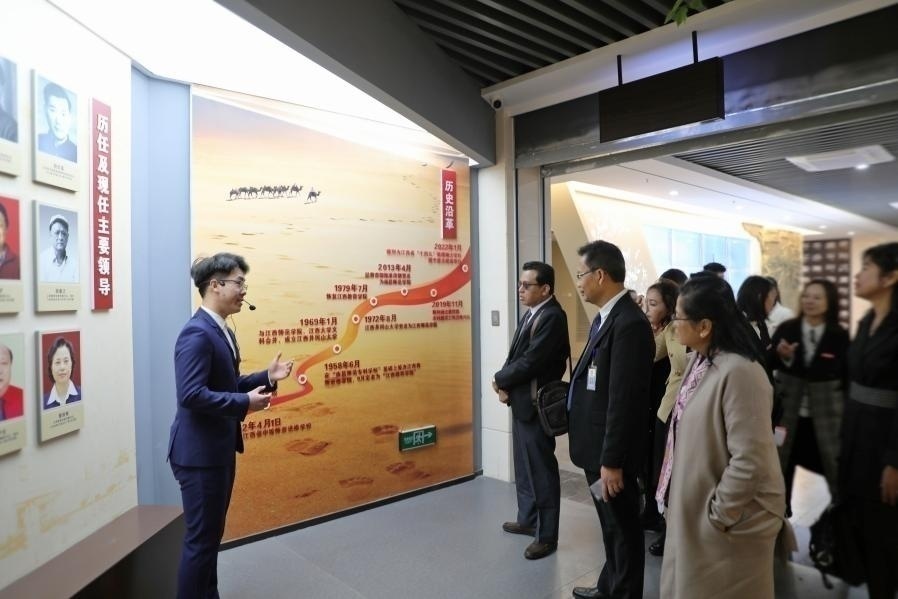 在逸夫艺术楼,代表团观看了舞龙舞狮、江西民歌、中国传统乐器以及民间舞蹈等多种方式的表演,对中国传统文化表示出浓厚的兴味,对南昌师范学院师生的精深技艺纷繁点赞并表示两校能够在音乐、舞蹈、体育、美术等方面展开文化交流。