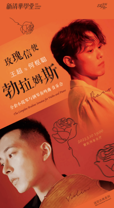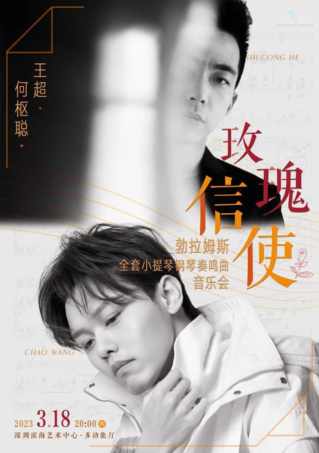 曲目单 德沃夏克 四首浪漫小品 Op. 75, B. 150 I. 中速的快板 II. 庄严的快板 III. 热情的快板 IV. 小广板 格里格C小调第三小提琴钢琴奏鸣曲 Op. 45 I. 十分热情的快板 II. 小快板 富有表示力的浪漫曲 III. 奄奄一息的快板 中场休息 弗朗克 A大调小提琴钢琴奏鸣曲 FWV 8 I. 中等速度小快板 II. 快板 III. 宣叙调 - 幻想曲 IV. 稍生动的小快板 (细致曲目与次第以实践为准) No. 02 玫瑰信使 王超与何枢聪 勃拉姆斯全套小提琴钢琴奏鸣曲音乐会 时间1:2023.03.10 19:00 地点1: 清华大学 蒙民伟音乐厅 时间2:2023.03.18 20:00 地点2: 深圳滨海艺术中心 多功用厅 钢琴:王超 小提琴:何枢聪