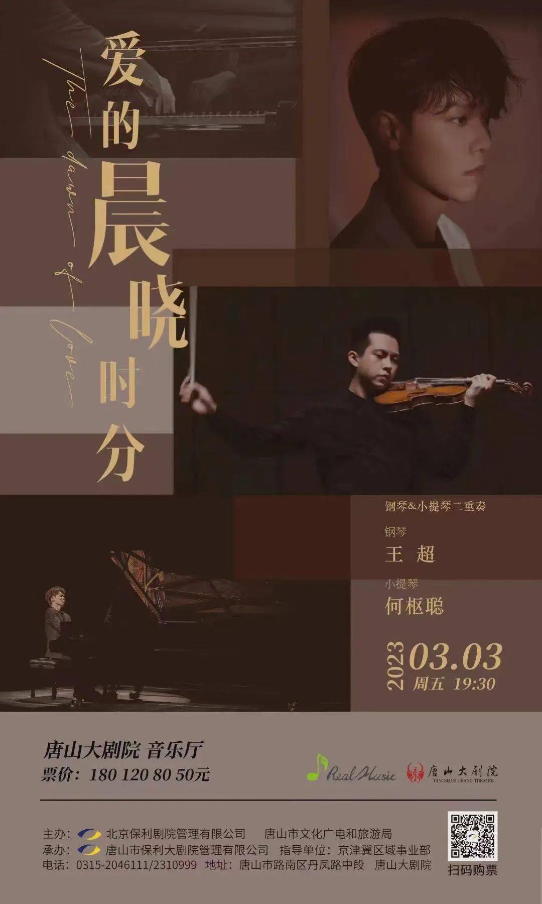 王 超 我院 2002级附小校友, 2003级附中校友 何枢聪 我院 2010级管弦系本科校友, 2015级硕士校友 / No. 01 爱的晨晓时分 钢琴&小提琴二重奏 时间:2023.03.3 19:30 地点:唐山大剧院 音乐厅 钢琴:王超 小提琴:何枢聪