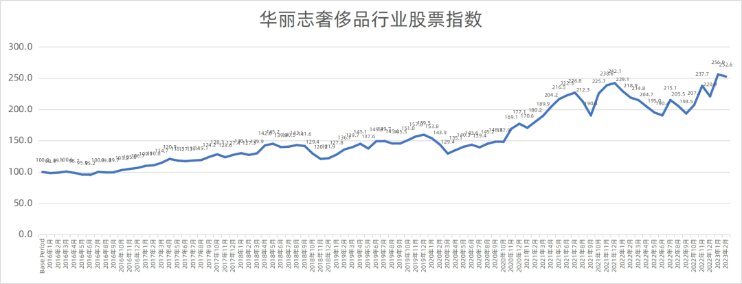 【华美志朴素品股票月报】2023年2月 从2016年起,《华美志》推出 “华美志朴素品行业股票指数”,截止 2023年2月底的全球朴素品行业股票走势如下图所示。