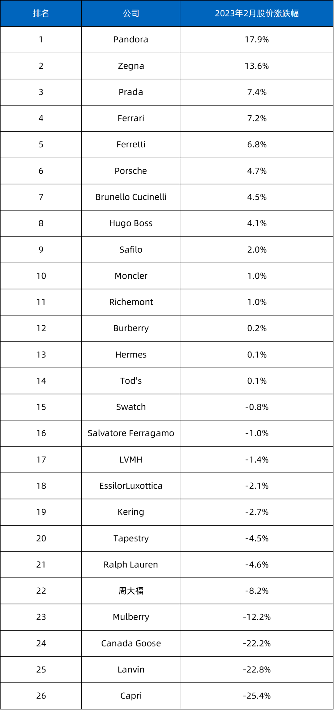 2023年2月涨幅最大的5只朴素品股票细致剖析如下: Pandora(上涨17.9%):这家丹麦珠宝品牌股价连续两个月上涨。本月初,集团发布了截至2022年12月31日的2022财年第四季度和全年关键财务数据。受品牌强劲势头的推进,总销售收入有机增长7%,抵达创纪录的265亿丹麦克朗, 高于此前4%至6%的预期。其中,第四季度销售额为99亿丹麦克朗,有机同比增长4%,高于剖析师预期的96亿丹麦克朗。 Zegna(上涨13.6%):这家意大利朴素品集团股价连续两个月上涨。本月,集团宣布收购加拿大功用性跑步品牌 Norda Run的少数股权,并计划在未来9年内逐步增加对品牌的投资。此次是自2018年收购 Thom Browne 后,杰尼亚时隔5年再次中止收购,也意味着杰尼亚集团正疾速扩展其投资组合,加速推进增长。今年早些时分,集团发布2022财年全年财务数据:全年销售收入14.93 亿欧元,增长 15.5%;假如不包含大中华区,收入增幅则抵达 42%。 Prada(上涨7.4%):这家意大利朴素品集团股价连续三个月上涨。本月,时兴指数网站 LYST在官网发布了第四季度Lyst指数榜单,Prada排名继续攀升,胜利超越Gucci, 问鼎全球最抢手的时兴品牌,本季度,该品牌搜索量增长了37%。而在第三季度Lyst时兴朴素品热榜中,Prada排名第二。今年早些时分,集团发布最新公告,任命Andrea Guerra先生为执行董事兼新行政总裁,Andrea Guerra曾是意大利眼镜巨头 Luxottica 集团的前首席执行官,还在2022年5月被任命为 LVMH 集团的战略及展开高级顾问。 Ferrari(上涨7.2%):这家意大利奢华汽车品牌股价连续两个月上涨。本月,集团发布了2022年全年的财务数据,净销售额初次突破了50亿欧元大关,抵达50.95亿欧元, 比上年大幅增长19.3%。月底,Ferrari于上海举行法拉利中国30周年庆典,法拉利中国30周年特别留念版 Roma初次亮相,由法拉利个性化定制中心携手中国著名设计师蒋琼耳共同打造。 Ferretti(上涨6.6%):这家意大利奢华游艇制造商股价连续四个月上涨。本月,集团率一支九艇舰队前往迈阿密 “发现航海”迈阿密国际游艇展参展,其中包含美国首秀的新款法拉帝860和wallypower58 及另外七艘游艇。 2023年2月跌幅最大的5只朴素品股票细致剖析如下: Capri(下跌25.4%):这家美国朴素品集团股价上月上涨后本月迎来大跌。本月,集团发布了截至2022年12月31日的2023财年第三季度财务业绩。销售额同比降落6%至15.1亿美圆,按固定汇率计算降落0.5%, 略低于预期;净利润2.25亿美圆,2022财年同期为3.22亿美圆。此外,截至12月底净库存为11.88亿美圆,比上年同比增长21%,集团估量经过一系列改善后,2023财年底库存水平将低于2022财年同期。在财报发布后的2月8日,由于业绩未抵达预期并下调其年度利润预测后,Capri 集团的股票在纽约证券买卖所大跌23.58% Lanvin Group(下跌22.8%):这家刚刚上市不久的时兴朴素品集团股价连续三个月下跌。本月,集团发布其2022年完成全年初步未经审计收入4.25 亿欧元,较 2021 年经审计收入同比增长38%。月初, 集团首席财务官 Shang Koo 宣布曾经辞职,集团执行总裁 David Chan 将暂时期理这一职位,目前集团正在寻觅 Koo 的继任者。 Canada Goose(下跌22.2%):这家加拿大高端功用性服饰和生活方式品牌股价上月上涨后本月迎来下跌。本月,集团发布了截至2023年1月1日的2023财年第三季度财报:遭到批发订单发货时间早于往常以及中国大陆遭到疫情管控的影响,本季度收入同比降落1.6%至5.767亿加元,归母净利润同比降落10.8%至1.349亿加元。Canada Goose加拿大鹅董事长兼首席执行官Dani Reiss表示,在第三季度的大部分时间里,特别是传统旺季12月,中国内地多家门店的运营和员工缺勤因疫情遭到影响,再思索到日益严峻的北美市场, 公司下调了年度业绩指导。 Mulberry(下跌12.2%):这家英国轻奢皮具消费商上月上涨后本月遭遇下跌。本月,集团宣布将 关闭其位于伦敦邦德街的门店,并抨击英国的销售税计划,称该计划使伦敦“无法生存”。Mulberry宣称,它不时是所谓的旅游税的受害者,即英国退出欧盟后,国际游客不能再请求返还20%的销售税。 周大福(下跌8.2%):这家中国香港珠宝巨头股价连续两个月上涨后本月迎来下跌。月底,集团宣布委任 黄燕琼女士(Annie Wong)为首席营运官,主要担任提升企业价值链效率,职能涵盖制定营运战略、产品及存货管理等范畴,这项任命已于2023年3月1日生效。Annie曾于数间世界知名的批发企业担任资深管理职位,包含连卡佛载思集团及PVH亚太分辨部等。 其他主要朴素品企业的最新意向: LVMH:本月,集团出资4300万欧元购入19世纪法国印象派画家、珍藏家 Gustave Caillebotte(居斯塔夫·卡耶博特)的名作《划船派对》(La Partie de bateau),赠予法国巴黎的奥赛博物馆;在2月4日世界癌症日来临之际,集团发布了对倡议“Working with Cancer(与癌症同行)”的承诺,为癌症患者倡导更开放、支持和容纳的企业文化;2月17日,LVMH 集团在意大利推出 “杰出巨匠奖”,旨在维护意大利制造工艺。 Hermès:本月,集团发布了截至12月31日的2022年度财务数据:综合营收同比增长29%至116亿欧元,按固定汇率计算增长23%;经常性停业利润为46.97亿欧元,经常性停业利润率40.5%, 创下十年来最高纪录。其中,亚太地域2022年销售额为66.57亿欧元,为集团贡献了57%的收入,是爱马仕第一大市场。第四季度,爱马仕持续了上一季度的强劲趋向,销售额同比增长26%至29.91亿欧元(按固定汇率计算:+23%)。 Kering:本月初,集团董事会主席兼首席执行官 Franois-Hen