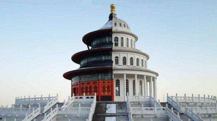 除了这些复制粘贴的人工建筑外,居然还有一座令人愈加难以了解的"双拼建筑",只见这座建筑一半是中国天坛,一半是美国白宫。这样的设计理念着实让人觉得有些"蹊跷"。在建筑的前面搭配的是汉白玉的台阶,固然整个景区项目还没有完成,但是汉白玉的台阶却有一些"掉色"。