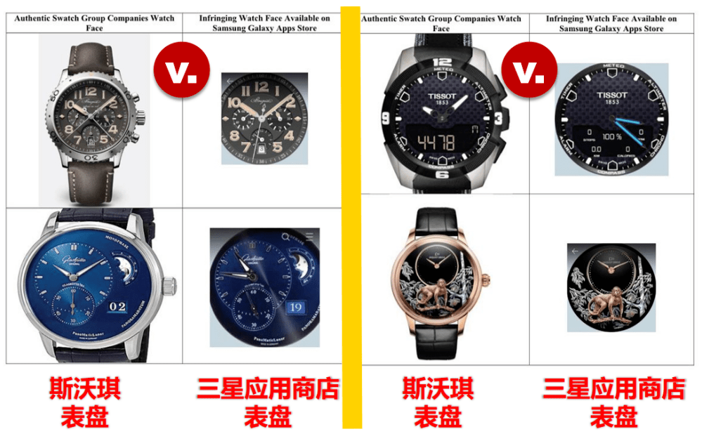 5月20日,英格兰和威尔士高等法院裁定韩国科技公司三星集团(Samsung Group)败诉,以为三星对其应用商店中由第三方的应用开发者上传的侵权内容负有义务。2019年,瑞士钟表制造商斯沃琪集团(Swatch Group Ltd.)起诉了三星侵犯其商标,由于在三星的应用商店Galaxy Store内存在着30多种可下载的智能手表的表盘,它们剽窃了斯沃琪实体手表表盘的设计,以至基本复刻了斯沃琪的商标。以数码的方式无限真实地模仿实体表盘正是三星智能手表的一大卖点。 遭到侵犯的斯沃琪集团的商标都有极高的市场价值,包含浪琴、欧米茄、斯沃琪、天梭,还有一款被侵犯的雅克德罗(Jaquet Droz)手表价值高达65万美圆。这些侵权的表盘适配的三星智能手表型号包含Gear Sport、Gear S3 Frontier、Gear S3 Classic、Galaxy Watch。