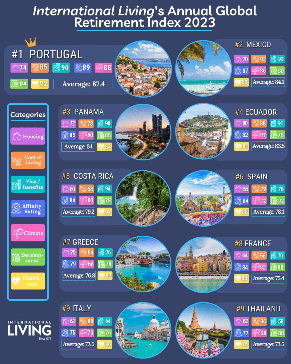 最近,美国权威生活杂志《国际生活》International Living依据7大规范,对全球16个国度中止剖析和评分,发布了《2023年全球最佳退休地点》(2023 Global Retirement Index)排名讲演,选择出最佳退休天堂! 最合适退休生活的目的地在哪里呢?哪个国度较易取得身份随时能够移居?小编带大家一同看看! 提起理想退休地点,人们自然会想到白色的沙滩、暖和的气候和无尽的阳光。美国权威生活杂志《国际生活》International Living依据7大尺度绳从另一个愈加量化的角度对退休问题中止了研讨。对全球16个国度中止剖析和评分和排名。包含以下7个方面 住屋成本(Housing) 取得身份难易度/ 退休福利(Visas/Benefits) 生活成本(Cost of Living) 受欢送度(Affinity Rating) 展开水平/ 政府管理(Development/Governance) 气候(Climate) 医疗保健(Healthcare) 2023年全球10大最佳退休国度 ( 2023 Global Retirement Index )