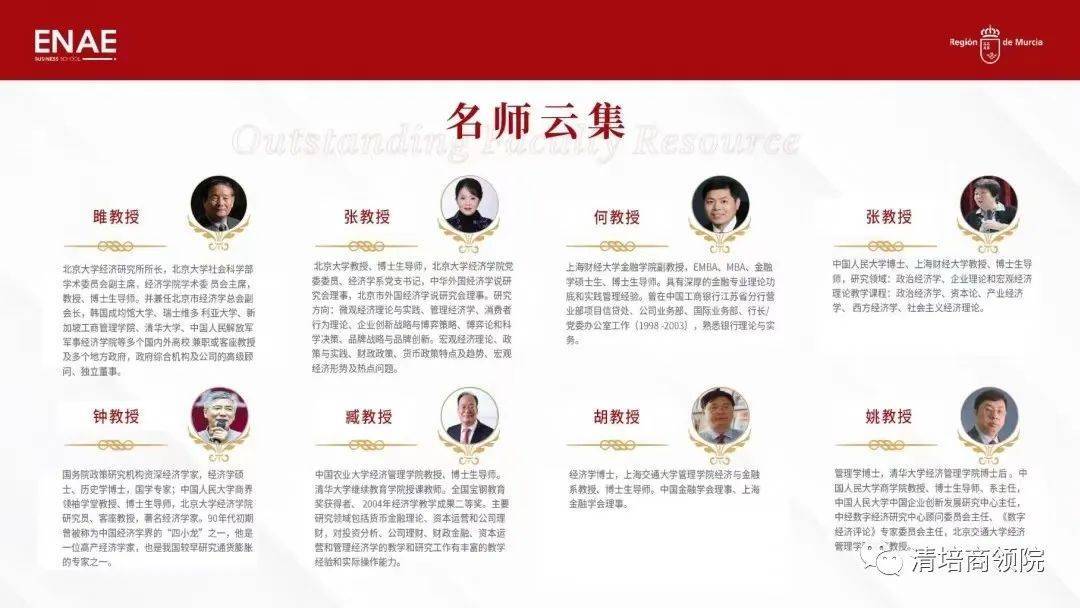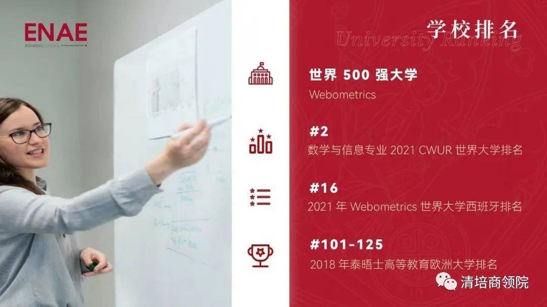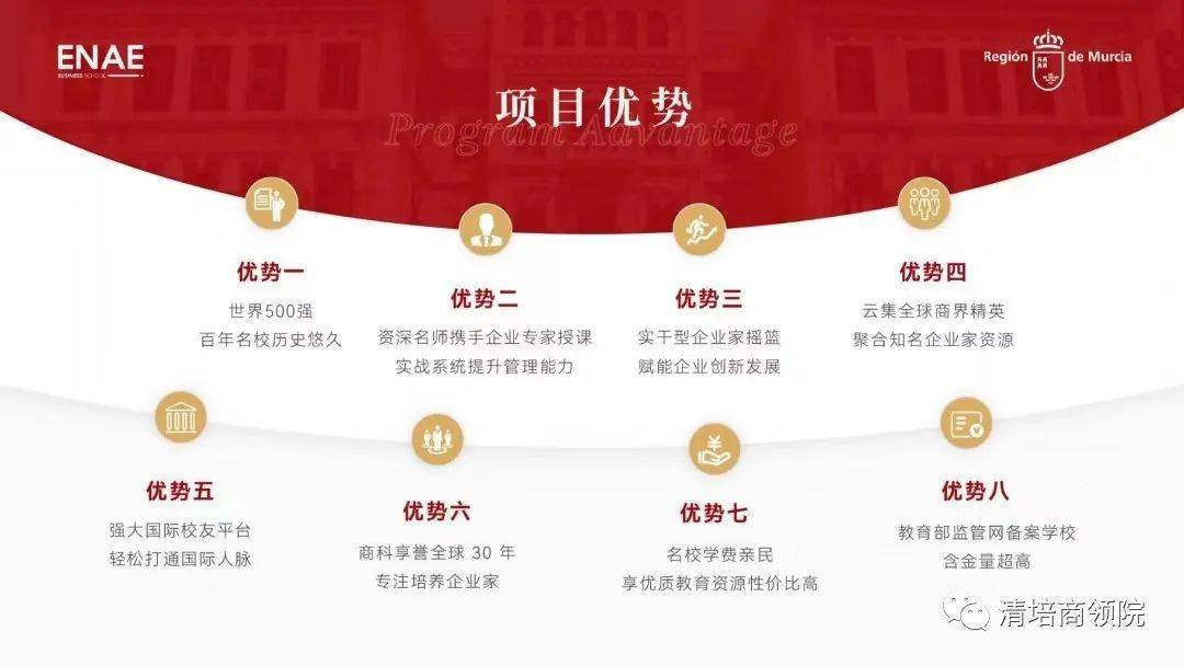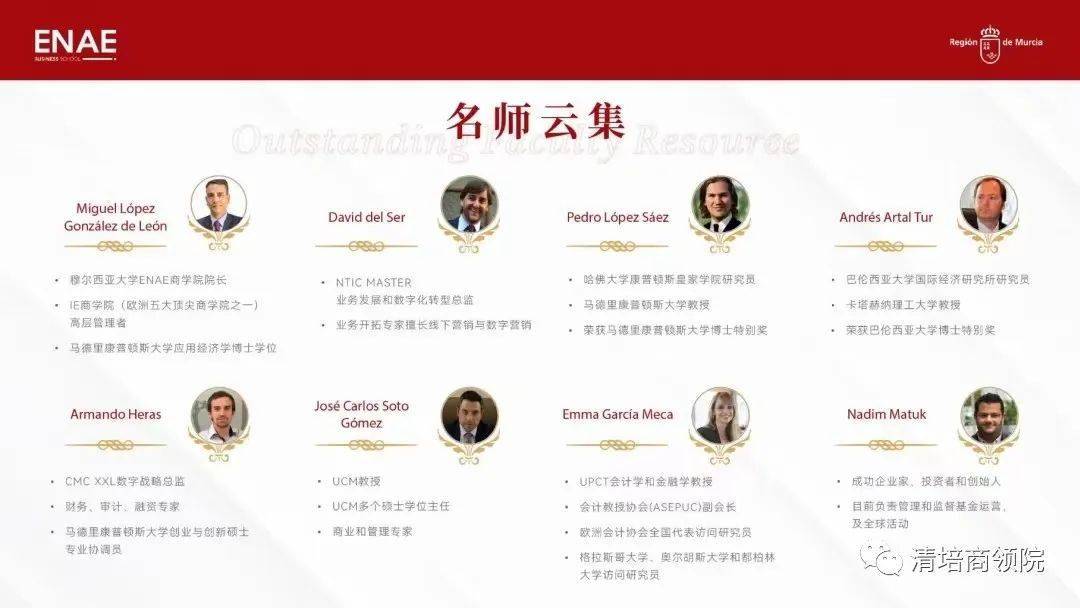 学校引见 穆尔西亚大学(UniversidaddeMurcia),西班牙著名综合性公立大学,由国王阿方索十世干 1272年亲身兴办,是西班牙最古老的大学之一。穆尔西亚大学具有 350个研讨小组、4个研讨中心和研讨所,涵盖一切学问范畴的教学和创新,有39 名研讨人员被斯坦福大学列为世界上最有影响力的人物之列。 作为数字技术、网络保险和人工智能范畴的先锋,穆尔西亚大学被欧盟委员会授予“人力资源杰出研讨”(HRS4R)奖章穆尔西亚大学谐和大量国际项目,是欧盟 ERASMUS 项目中积极院校,是地中海沿岸科研与商业的战略桥梁。 ENAE商学院 ENAE 商学院旨在培育卓有成就的指导者,作为西班牙最好的商学院之一。 ENAE 商学院主要教授商科类硕士课程,课程在西班牙数一数二,高管课程位列 2020 年《财经》排行榜第二名。 除了西班牙总部之外,ENAE商学院分校遍布整个美洲,在美国、哥伦比亚、墨西哥、危地马拉、巴拿马、厄瓜多尔、多米尼加共和国、哥斯达黎加、委内瑞拉等地域和国度都设有分校。同时与350多家优秀企业、50多家世界著名大学中止战略协作,弥合了大学与商业世界之间的鸿沟,引领全球经济与商业研讨。辅佐学生与企业高管、教授、顾问、HR 树立密切联络,冷静面对全球化瞬息万变的市场。 权威认证