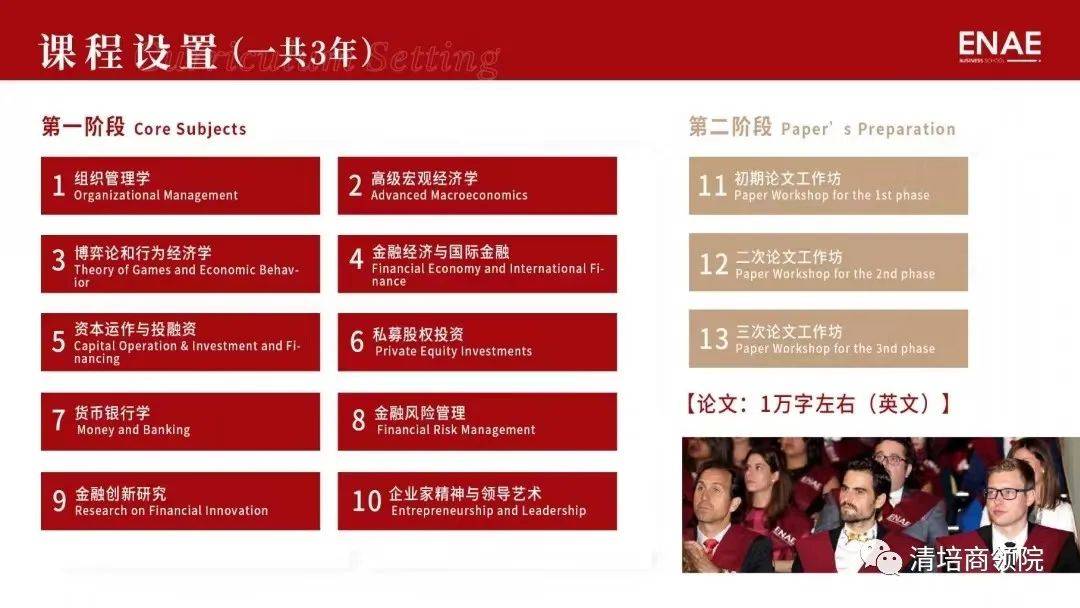课程布置 学制:3年 学分:每年 60 学分,一共 180 学分 授课言语:英语授课,专业助教全程中文效劳 上课方式:线上+线下混合教学 毕业请求:发表一篇期刊或撰写毕业论文 课程设置