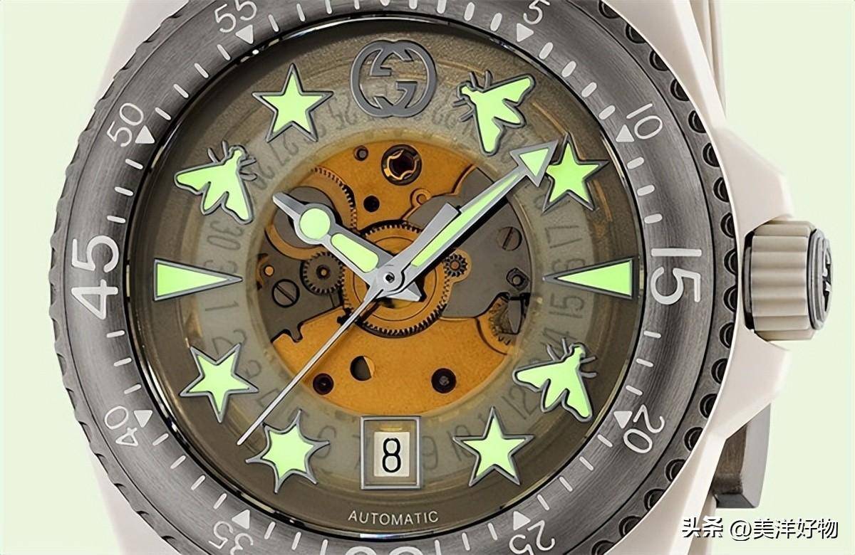 ▲面盘的多元外型时标为表款一大特性,且时标与指针上都有夜光物料强化夜视效果。 面盘上具有Dive系列招牌的多元外型时标,包含GUCCI的双G Logo、星星与蜜蜂等交错排列成为12个时标,同时面盘内圈还开了一个圆形视窗,显露底下机械机芯的结构,而多元外型时标环的部分用的又是偏半透明的材质,所以底下的日期环不会赤裸裸地呈现于佩戴者眼前,这样的益处在于手表显时不会被干扰,但又同时透过巧思展显露机械表的实质。